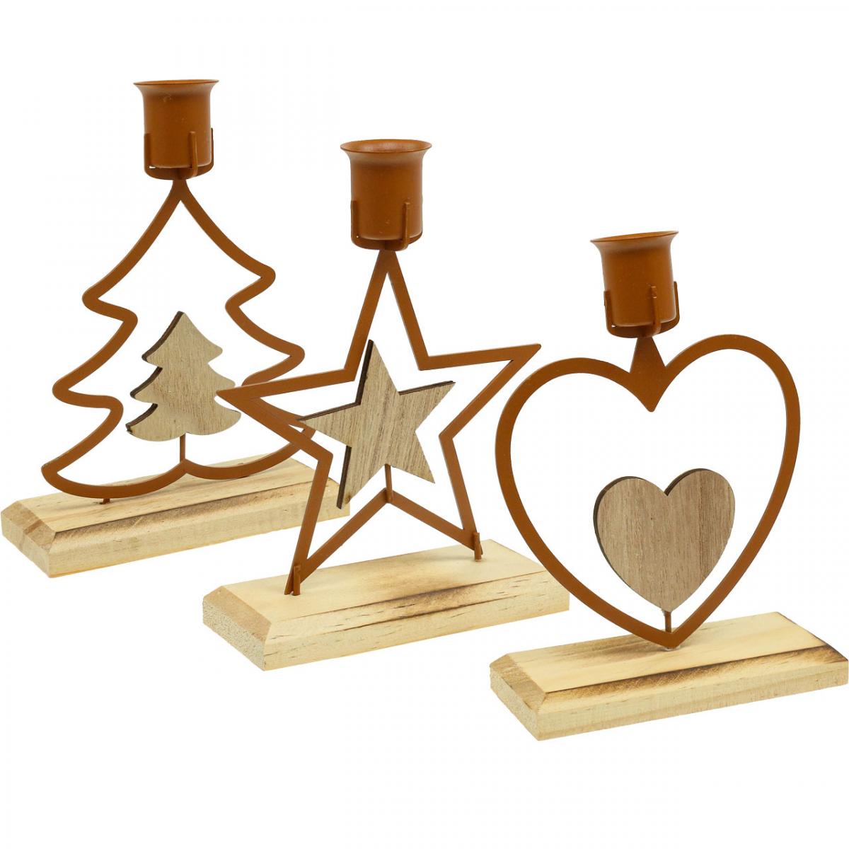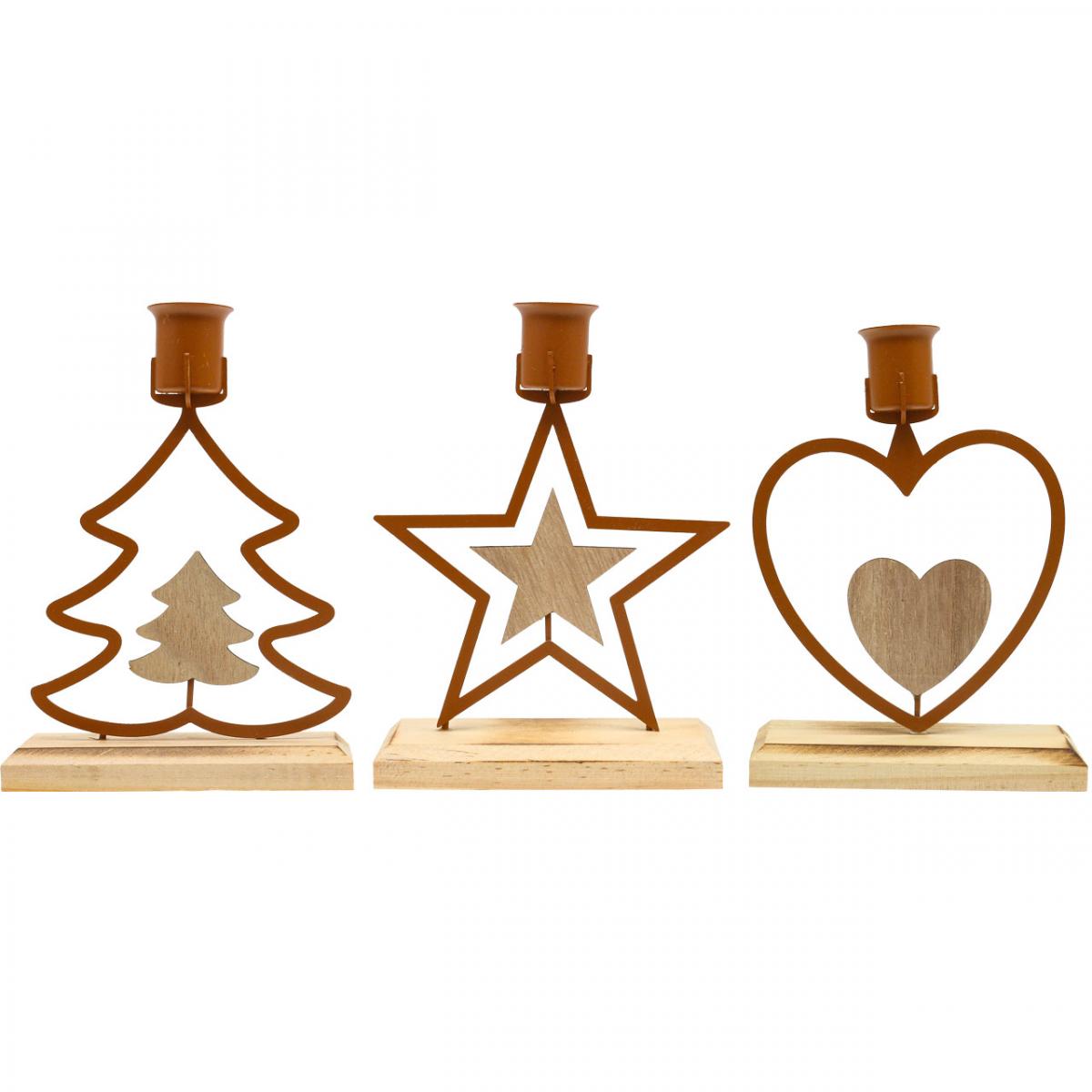 Produktname: Kerzenhalter Stabkerzen Stern Herz Tanne Braun H16,5cm Sortiert 3St
