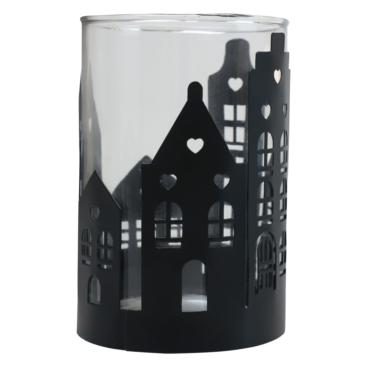Dieser Kerzenhalter imponiert mit einer umlaufenden Stadtsilhouette aus unterschiedlichen, aneinandergereihten Häuserfronten. Als Windlicht zu Weihnachten ist der Teelichthalter aus Metall mit Kerzenglas wunderbar geeignet.