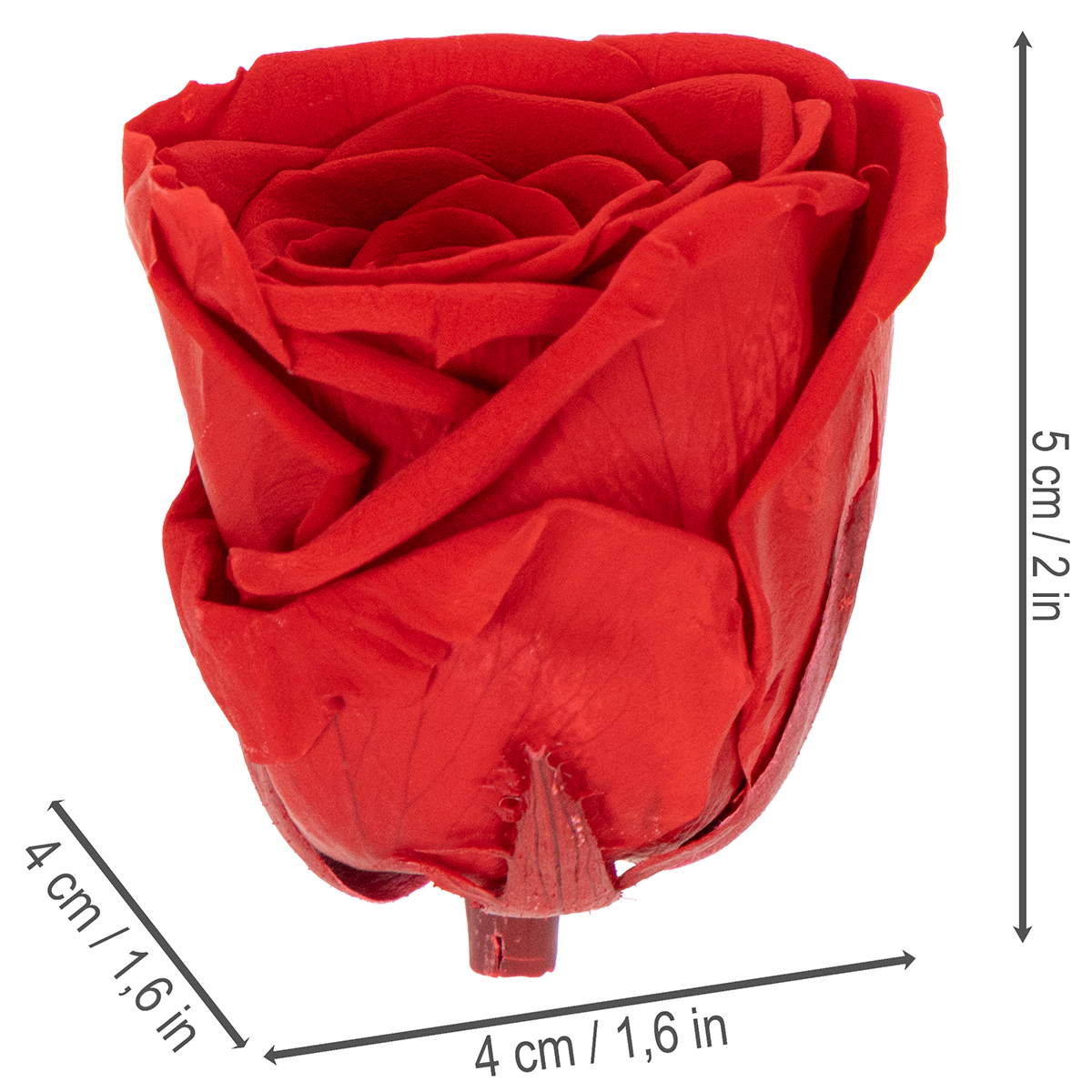 Unsere konservierten Rosen überzeugen durch ihre brillante rote Farbe und die hochwertige Verarbeitung. Jede Rose wird sorgfältig ausgewählt und durch einen speziellen Konservierungsprozess haltbar gemacht. So bleibt die natürliche Textur und Optik der Blume erhalten – als wäre sie frisch gepflückt. Mit einer Größe von etwa 5 cm Höhe und 4 cm Durchmesser sind die Rosen perfekt proportioniert, um in jeder Dekoration zu glänzen.