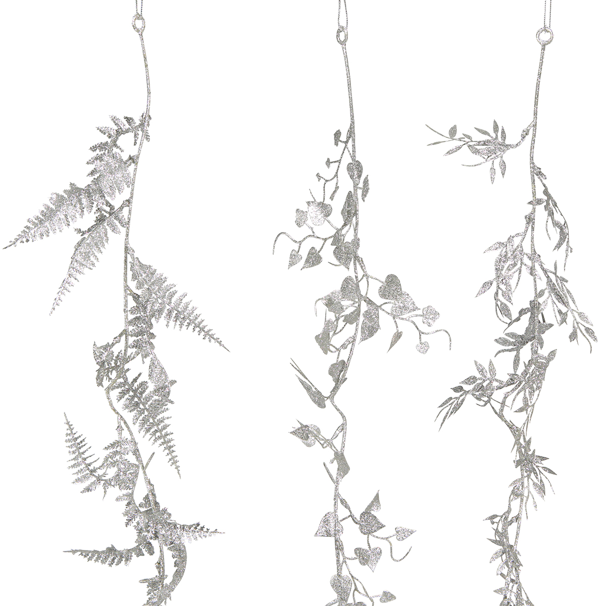 Verzaubern Sie Ihr Zuhause mit unserer glitzernden Dekoration mit Blättern und Farnen. Die künstliche Girlande in Silber ist zu jeder Jahreszeit, insbesondere aber zu Weihnachten, eine strahlende Dekoration für ein festliches Ambiente. Mit einer Länge von 180cm und dreifach sortiert eignet sich die silberne Dekogirlande ideal als stilvoller Blickfang.