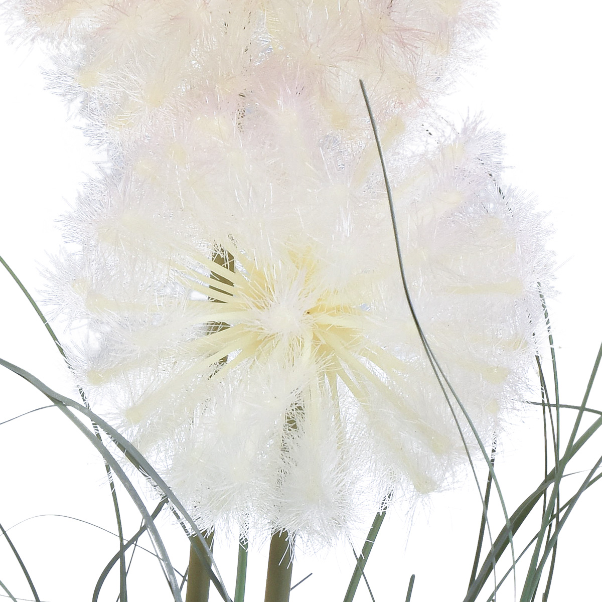 Ganz klare Stars dieser künstlichen Topfpflanze sind die zwei großen, buschigen Kugeln der Wiesenblume. Die Samen sind so wirklichkeitsgetreu gestaltet, als könnte sie der Wind jederzeit davontragen.