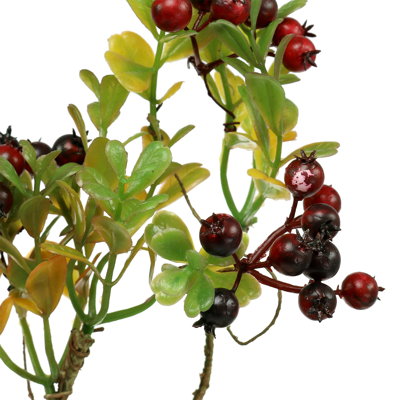 Der dekorative Beerenstrauch der Zwergmispel, botanisch bekannt als Cotoneaster, ist sehr hochwertig verarbeitet; Beeren, Blätter und Äste des Beerenpicks sind sehr detailliert gestaltet und zeigen einen natürlichen Wuchs. Viele kleine rote und schwarze Beeren mit abstehenden Kelchblättern sitzen auf schirmtraubigen Blütenständen, die aus einem dichten Geäst von Blattstielen herausragen, das von vielen kleinen Laubblättern gesäumt ist. Der Stiel des Deko-Strauches ist zudem mit rustikalem Papier umwickelt, was ihm eine besonders realistische Erscheinung verleiht, und darüber hinaus mit einem flexiblen Drahtkern ausgestattet. Damit ist die Kunstpflanze ein ideales Werkstück für Ihre herbstliche Floristik, egal ob als Teil von Bouquets oder gesteckt in Steckschaum, Styropor beziehungsweise Moos.