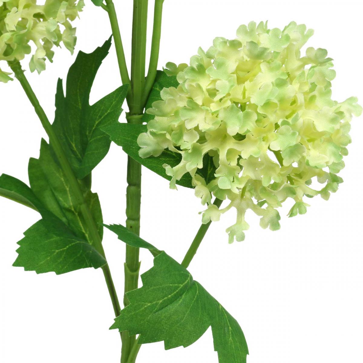 Der Schneeball in Grün besteht aus einem langen Ast mit biegsamen Metallkern, der mit fünf unterschiedlich großen runden Dolden mit gelbgrünen Stoffblüten, sowie zwei Knospenzweigen besetzt ist. – Viele grüne typisch geformte Blätter des Virburnum runden die Optik der künstlichen Pflanze noch ab.