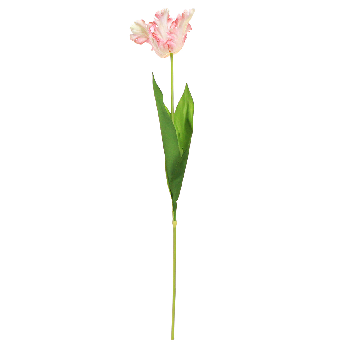 Die Blütenblätter zeigen das weiße und zartrosa Muster der Gartenblume und auch der charakteristisch flammenförmige Blütenkelch ist erstaunlich realistisch nachgebildet. Die prächtige Blüte wird durch textile Blätter in lebendigem Grün ergänzt, wodurch ein realistisches Gesamtbild entsteht. Die langen Stiele ermöglichen es Ihnen, die Tulpen in verschiedenen Arrangements zu platzieren, sei es in einer Vase oder als Teil einer größeren Blumendeko.