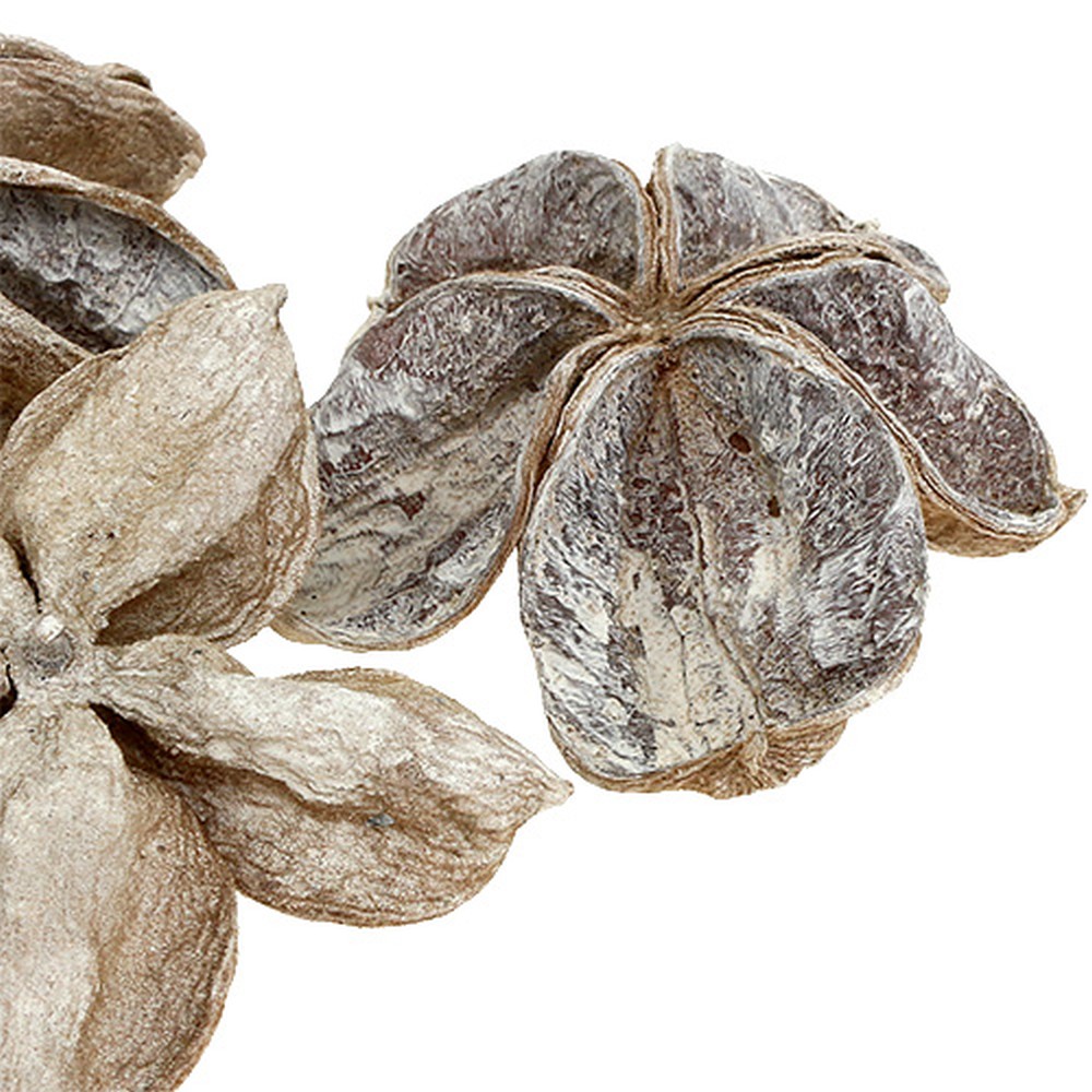 Wenn Sie Ihren Trauerkranz zu Totensonntag oder zu Allerseelen entwerfen, dann fügen Sie diesen edlen, in Weiß gewaschenen Landlotus hinzu! Sie erhalten mit diesem hochwertigen Artikel aus der Gedenkfloristik eine anmutige Trockenblume, die ihre löffelartigen, geweißten Blüten offen zur Schau stellt. So können Sie die Blüten sehr schön zum Dekorieren von einem Gedenkgesteck verwenden und damit eine anmutige Trauerdekoration erstellen, die Sie beispielsweise als Grabauflage nutzen können.Aber auch als Tischdekoration für die Trauerfeier punktet dieser Deko-Lotus, der auch Sterculia urens genannt wird. So können Sie entweder die ganze Blüte verwenden oder einzelne Blätter leicht abtrennen, um sie ebenfalls in einem Gesteck oder in einer Raumdekoration unterzubringen. Sie haben auch die Möglichkeit, die Trockenpflanze als Weihnachtsdekoration für einen Adventskranz oder eine Fensterdekoration zu nutzen.