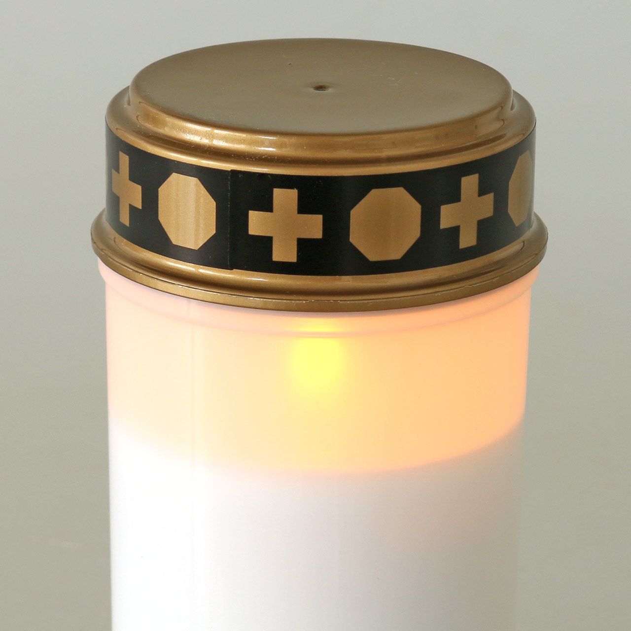 Das schlichte Grablicht in Weiß hat einen goldfarbenen Deckel. Der Rand des LED-Lichts ist mit einer schwarzen Bordüre aus Kreuzen und Achtecken verziert. Das Grablicht sieht wie eine normale Grabkerze aus. Doch es handelt sich um keine Wachskerze. In die Hülle des weißen LED Teelichts ist eine langlebige LED-Kerze eingelassen. Ihr Licht brennt fast wie das einer echten Kerze und leuchtet durch die halb transparente weiße Hülle.