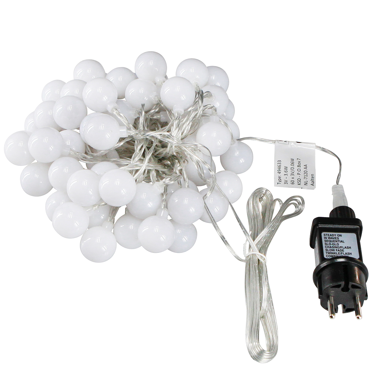 Die Lichterkette ist insgesamt 9 Meter lang, wovon 5 Meter auf die Zuleitung entfallen. Die weißen Kugeln besitzen jeweils einen Durchmesser von circa 2,8 Zentimetern, wobei der Abstand zwischen ihnen in etwa 15 Zentimeter beträgt. Die Lichterkette ist für den Innen- und Außenbereich geeignet sowie strombetrieben und wird Netzteil für die Steckdose geliefert.