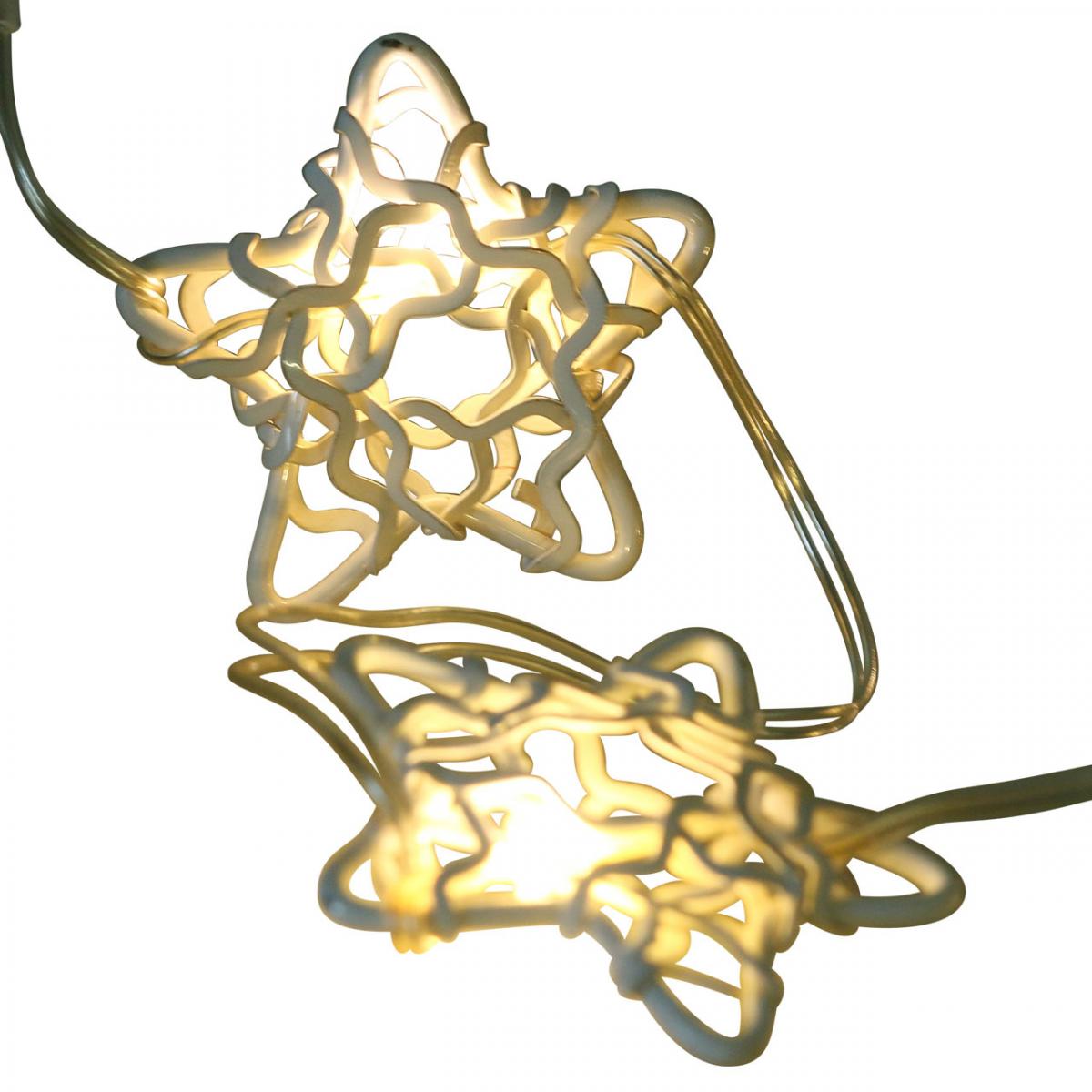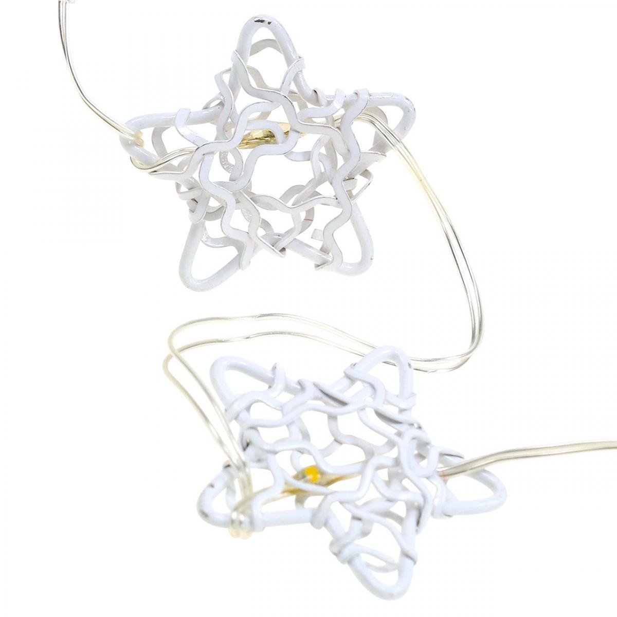 Aus 20 kleinen Deko-Sternen mit LED und in Weiß erstrahlt die Lichterkette für innen. Die LED-Sterne sind alle durch einen biegsamen silberfarbenen Draht miteinander verbunden, welcher das Drapieren um Weihnachtsgestecke oder Weihnachtsbäume umso einfacher macht.