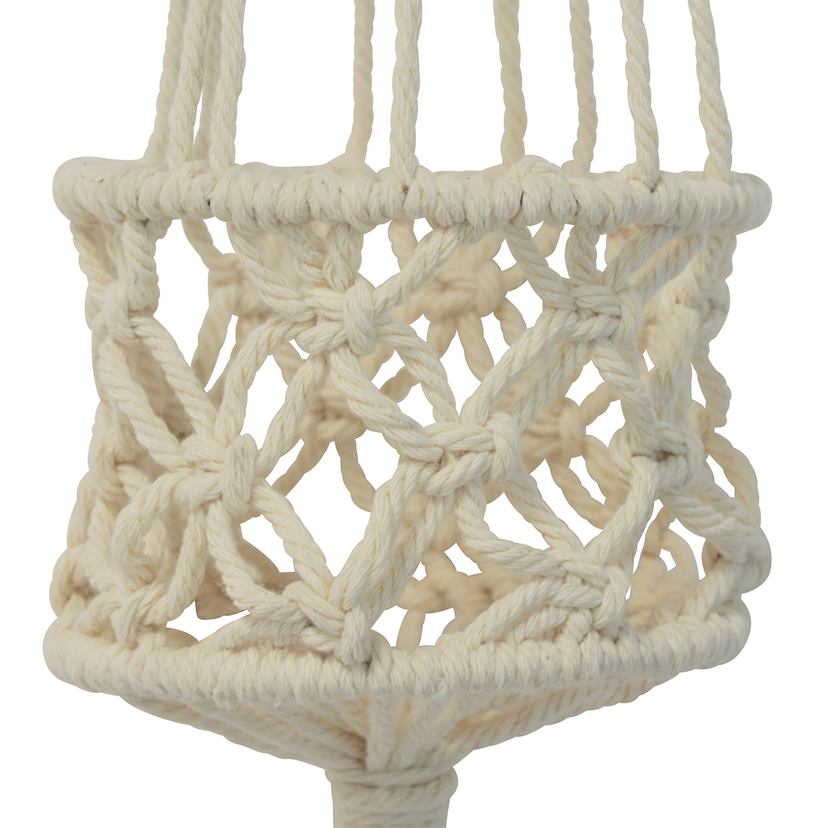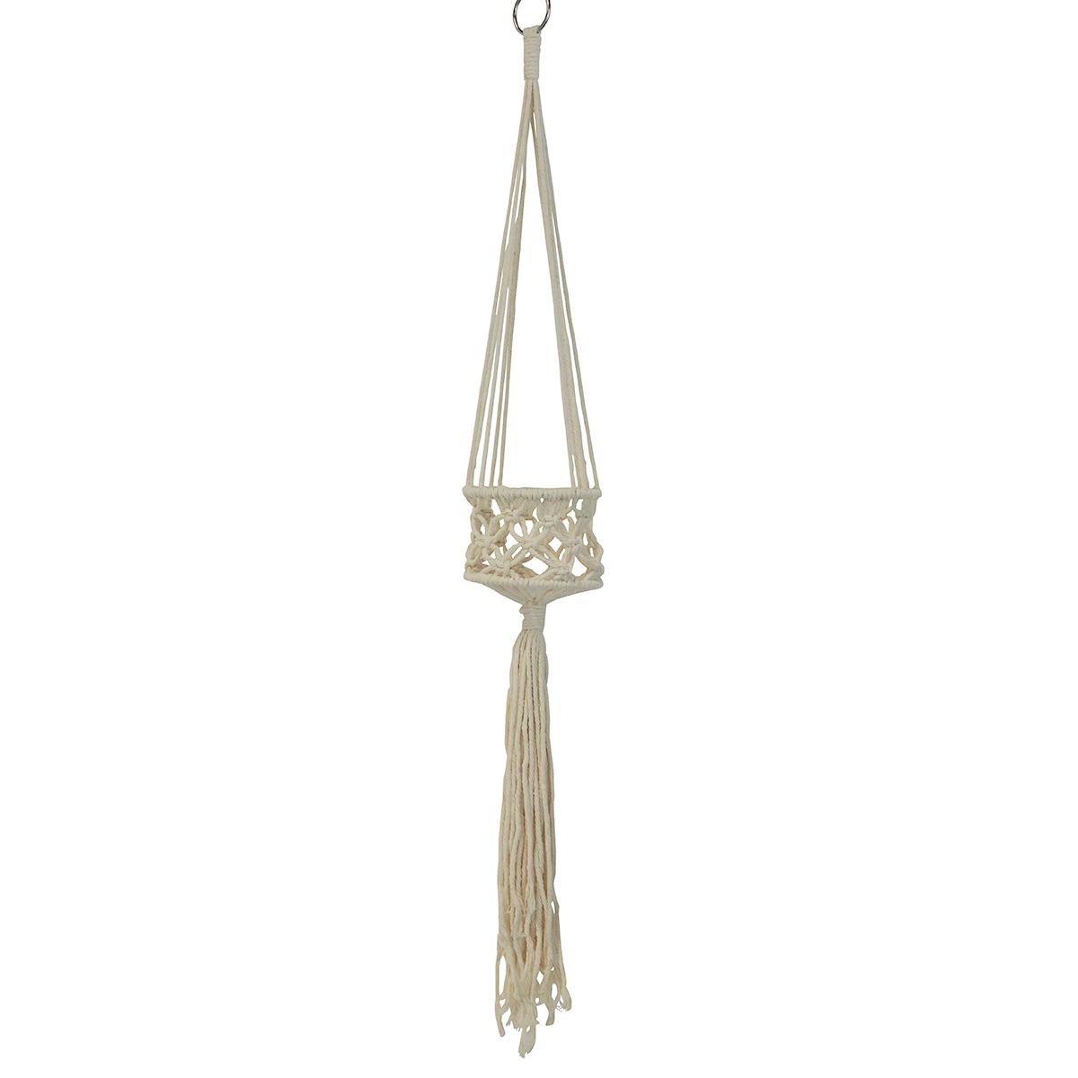 Sie erhalten die Hängedeko aus Makramee in einer Gesamtlänge von etwa 79 Zentimtern bei einem Durchmesser von etwa 12 Zentimetern. Zwischen Boden in der Öffnung und dem Ring zum Aufhängen bleibt etwa 40 Zentimeter in der Höhe Platz für Ihre Gefäße.