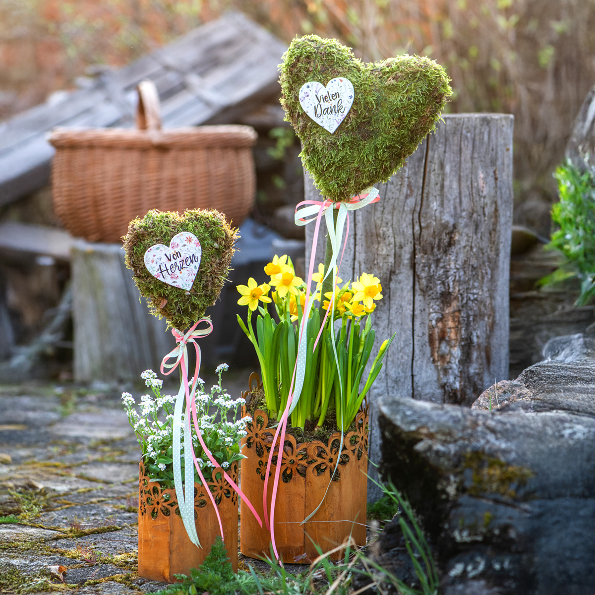 Blumen und Rost-Deko sind zugleich wunderbar geeignet für den angesagten Vintage-Stil. Aber auch in einem Arrangement mit viel Naturdeko wie zum Beispiel Beerenzweigen oder einem Trockenstrauß macht die Metall-Deko als Übertopf eine gute Figur.