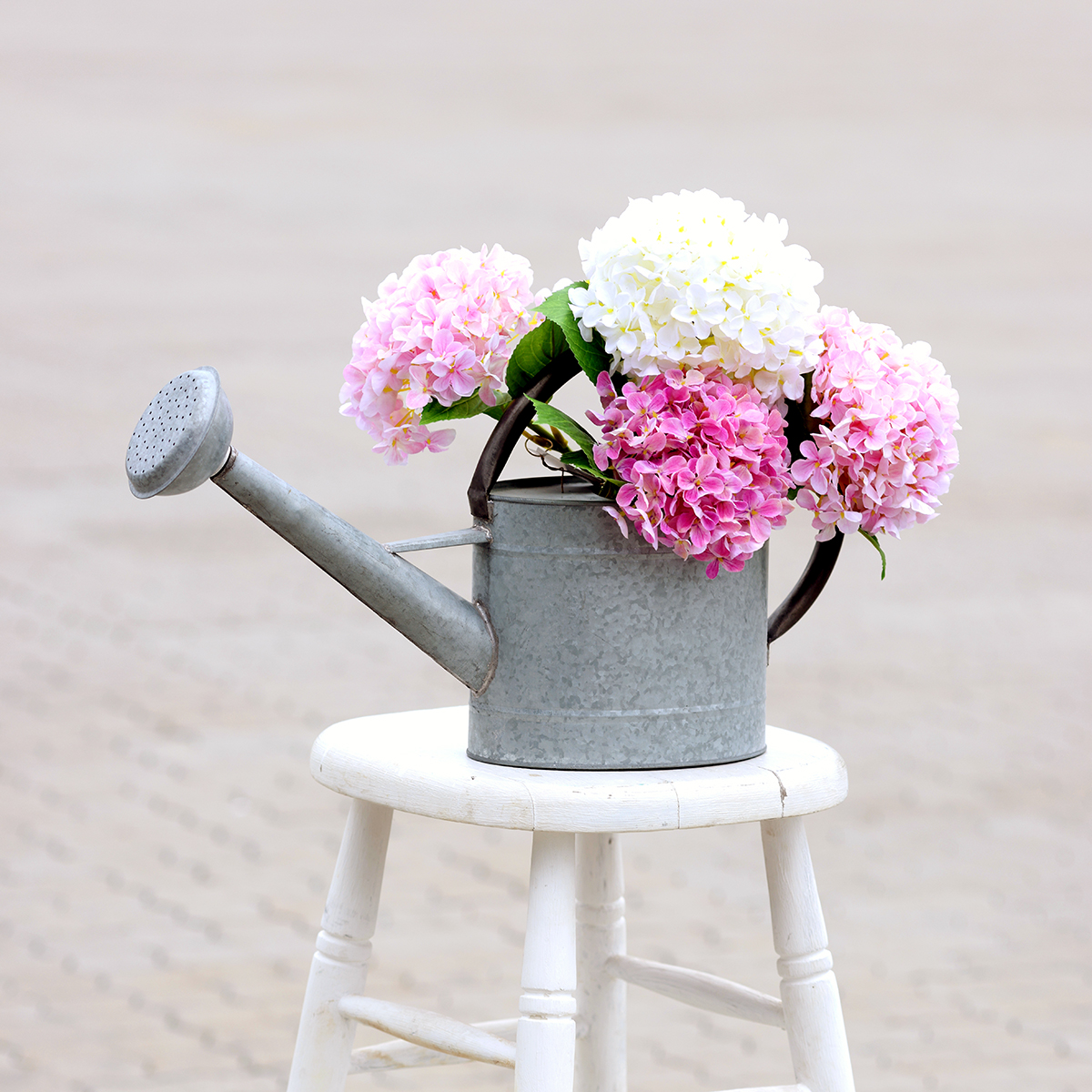 Da sie über einen durchgehenden Hals verfügt kann die Zinkkanne durchaus zum Wässern von Blumendeko eingesetzt werden.