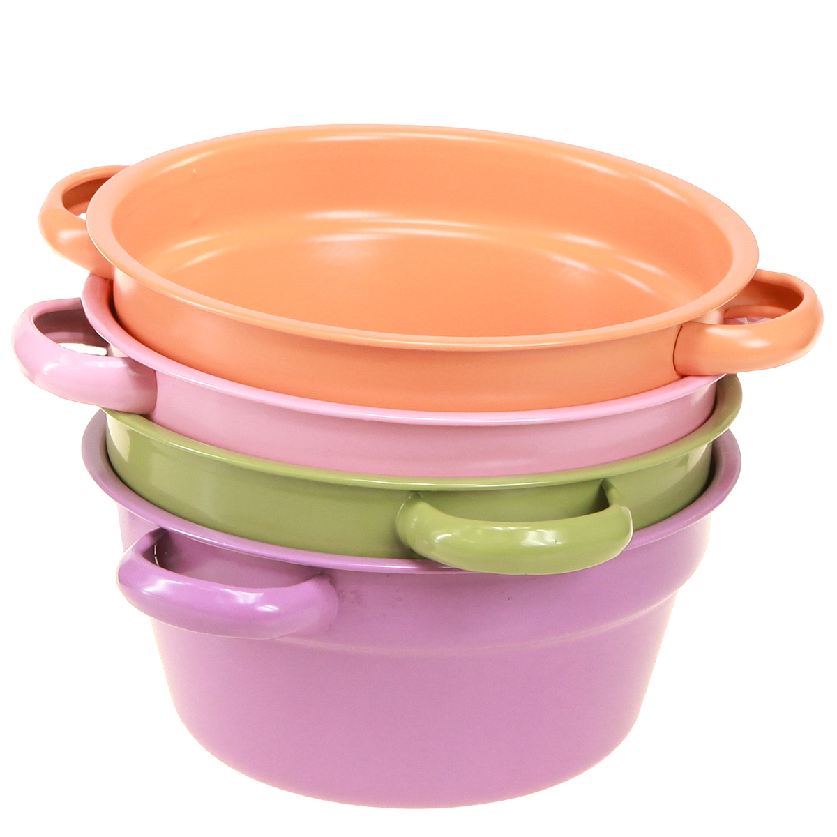 - Vier Metallschüsseln in frühlingshaften Farben: Rosa, Grün, Violett und Orange