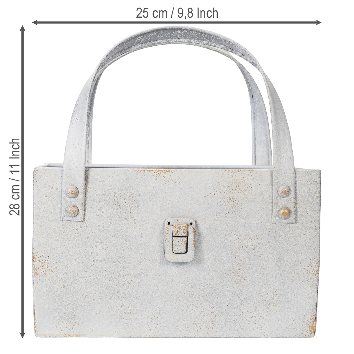 Sie sind auf der Suche nach einer eleganten und gleichzeitig praktischen Möglichkeit, Ihr Zuhause oder Ihren Garten zu verschönern? Diese moderne Metalltasche bringt genau die richtige Mischung aus Stil, Funktionalität und Charme für jeden Bereich mit. Mit ihrer dezenten Vintage-Optik und dem robusten Design wird sie schnell zum Highlight Ihrer Inneneinrichtung oder Gartengestaltung. Stellen Sie sich vor, wie Ihre Pflanzenarrangements in dieser Metalltasche mit Henkel perfekt zur Geltung kommen. Oder wie sie im Eingangsbereich für eine rustikale Wohlfühlatmosphäre sorgt! Von der Verwendung als Organizer für Werkzeuge bis hin zur ausgefallenen Blumendeko, diese Metalltasche bietet zahlreiche kreative Einsatzmöglichkeiten. Ob im Garten, auf der Terrasse oder im Wohnzimmer: Mit diesem Deko-Element setzen Sie überall stilvolle Akzente.