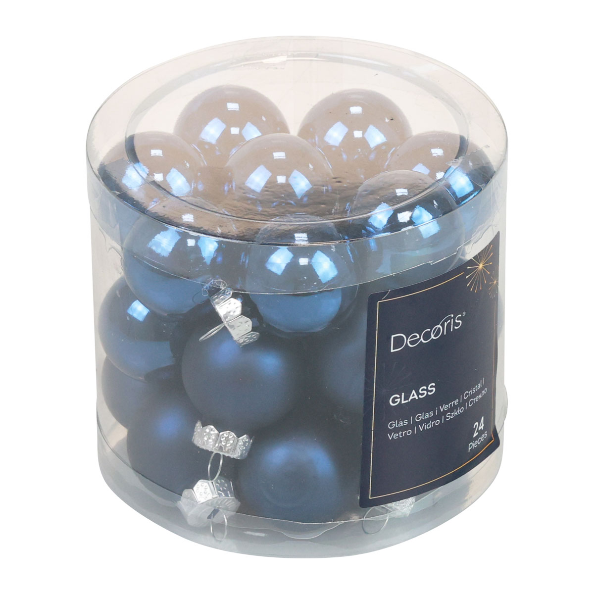 22 Weihnachtskugeln erhalten Sie in diesem zauberhaften Blau mit den glänzenden silbernen Anhängern. Matte und glänzende Varianten beinhaltet der Artikel.
