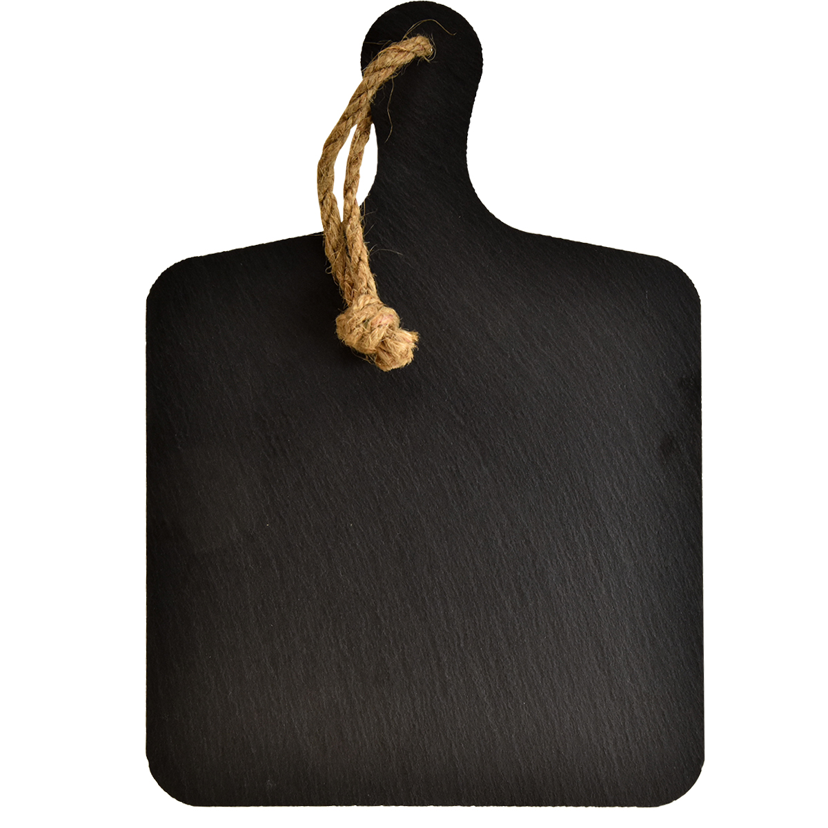 Die Platte aus natürlichem Schiefer kommt mit einem Griff mit Bohrung. Zum Aufhängen ist das Schiefertablett mit einer rustikalen Jutekordel versehen. So lässt sich das Naturstein-Tablett sowohl legen, an der Wand anlehnen oder dekorativ Aufhängen. Schiefer-Platten lassen sich auch wunderbar beschreiben – nutzen Sie für diesen Zweck Kreidestift oder für dauerhafte Dekorationen Permanent oder Acrylstifte.