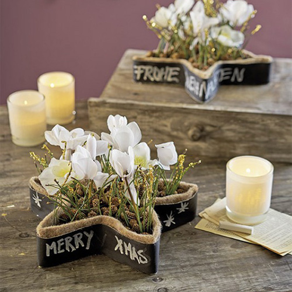 Besonders beliebt ist die Sternform natürlich in der Weihnachtszeit. Auch in der Trauerfloristik gewinnt sie mehr und mehr an Bedeutung. So können Sie die Sterne je nach Anlass mit Zapfen, Beeren und einer Kerze bestücken. Weiße Blüten, Schnittgrün und Trauerbänder mit Trost spendenden Sprüchen sind auch denkbar. Die Ränder können mit Tannengrün und anderen Dekomaterialien, wie Bändern, abgedeckt werden. Mit doppelseitigem Klebeband lässt sich die Blumensteckmasse auf glatten Flächen befestigen, zum Beispiel auf einem Sarg oder auf einem Geschenk.