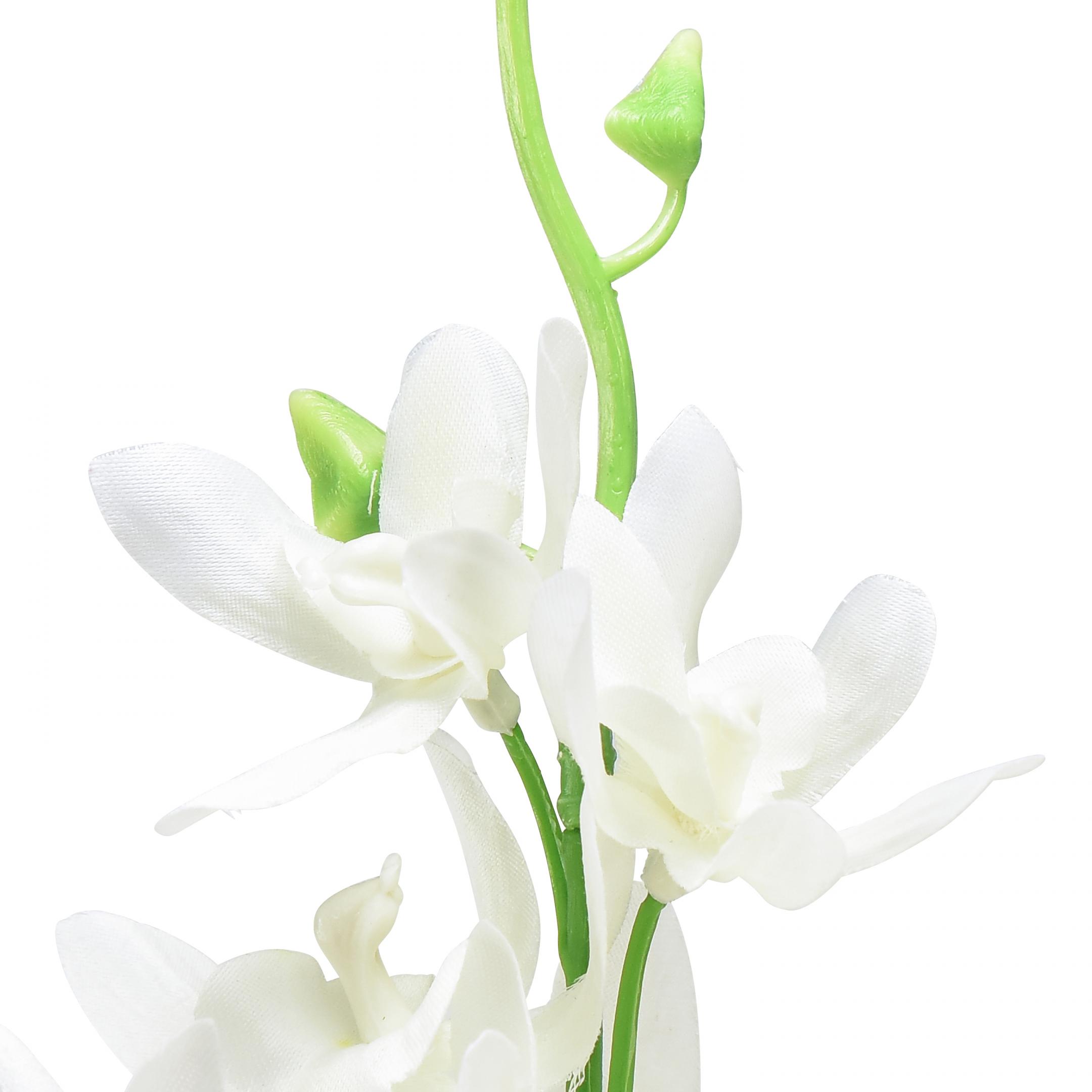 Diese Kunstblume bildet eine Orchidee nach, die weißem Oncidium ähnelt. So sind die zwei Rispen, in die sich der Stiel verzweigt, über und über mit schmalblättrigen kleinen Blüten bedeckt, die sternförmig erscheinen. Knospen in Weiß und hellem Grün runden die großartige künstliche Orchidee ab.