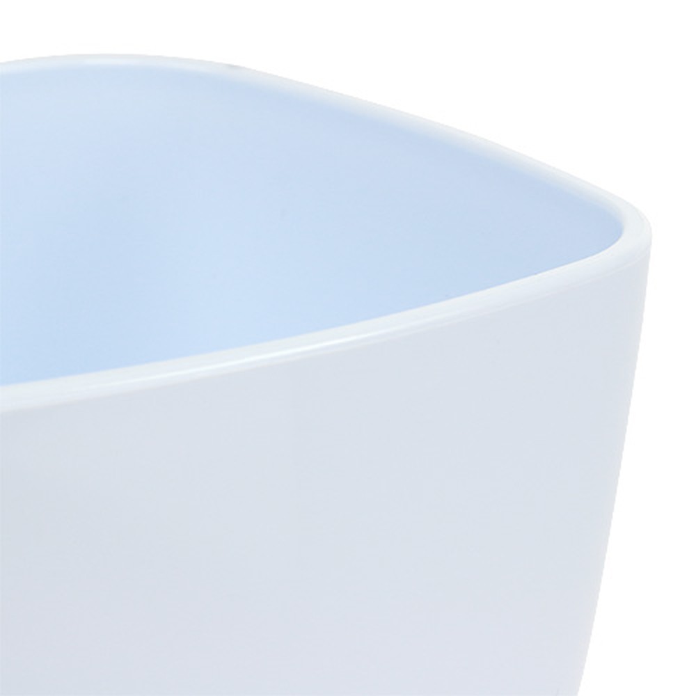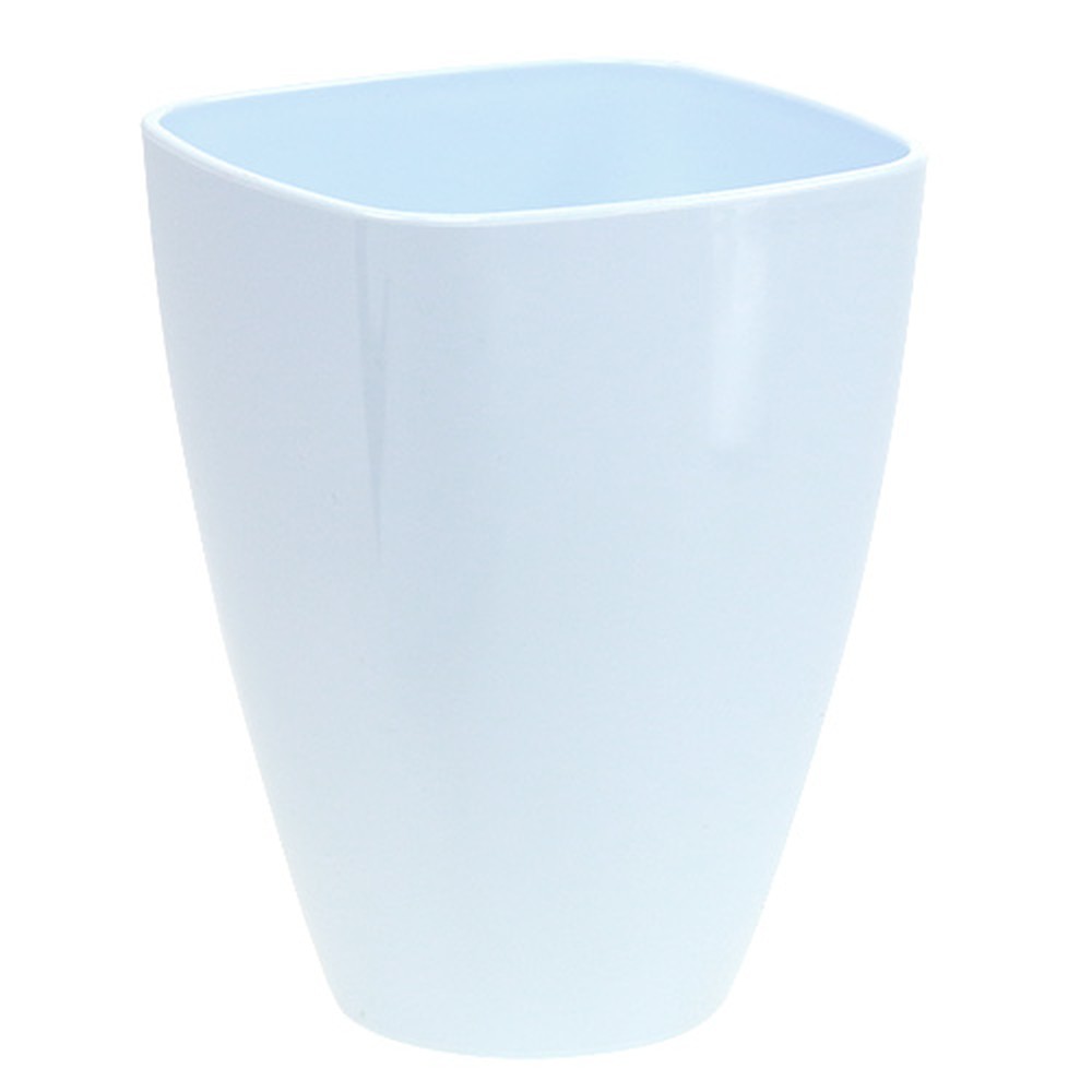 Der glänzend weiße Orchideentopf ist aus leichtem Kunststoff gefertigt und ungefähr 17 Zentimeter hoch. Oben besitzt er einen Durchmesser von circa 12,5 Zentimetern, die Stellfläche misst in etwa 7,5 Zentimeter. Im Inneren befindet sich eine ungefähr 4,5 Zentimeter hohe Einbuchtung, auf welche der Pflanztopf gestellt wird.