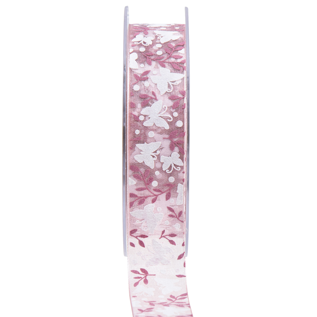 Das Organzaband in Rosa mit dem Schmetterlingsmuster ist auf eine Rolle aus Kunststoff gewickelt und hat eine Länge von etwa 20 Metern bei einer Breite von ungefähr 25 Millimetern.