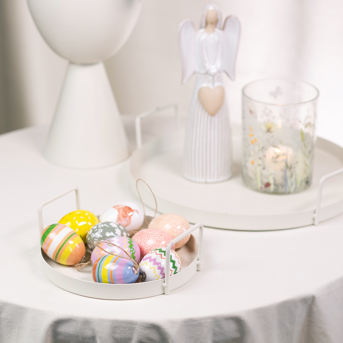 Diese charmanten Osterei-Anhänger sind praktisch und stilvoll zugleich. Jede der zwölf Miniaturen wurde mit filigranen Mustern liebevoll gestaltet und besticht durch den zeitlosen Charakter ihrer Farben und Designs. Die handliche Größe von 6 cm ist ideal für unterschiedlichste Dekoideen. Dank des robusten Kunststoffmaterials sind die Anhänger strapazierfähig und langlebig – sowohl für den Innen- als auch den geschützten Außenbereich geeignet.
