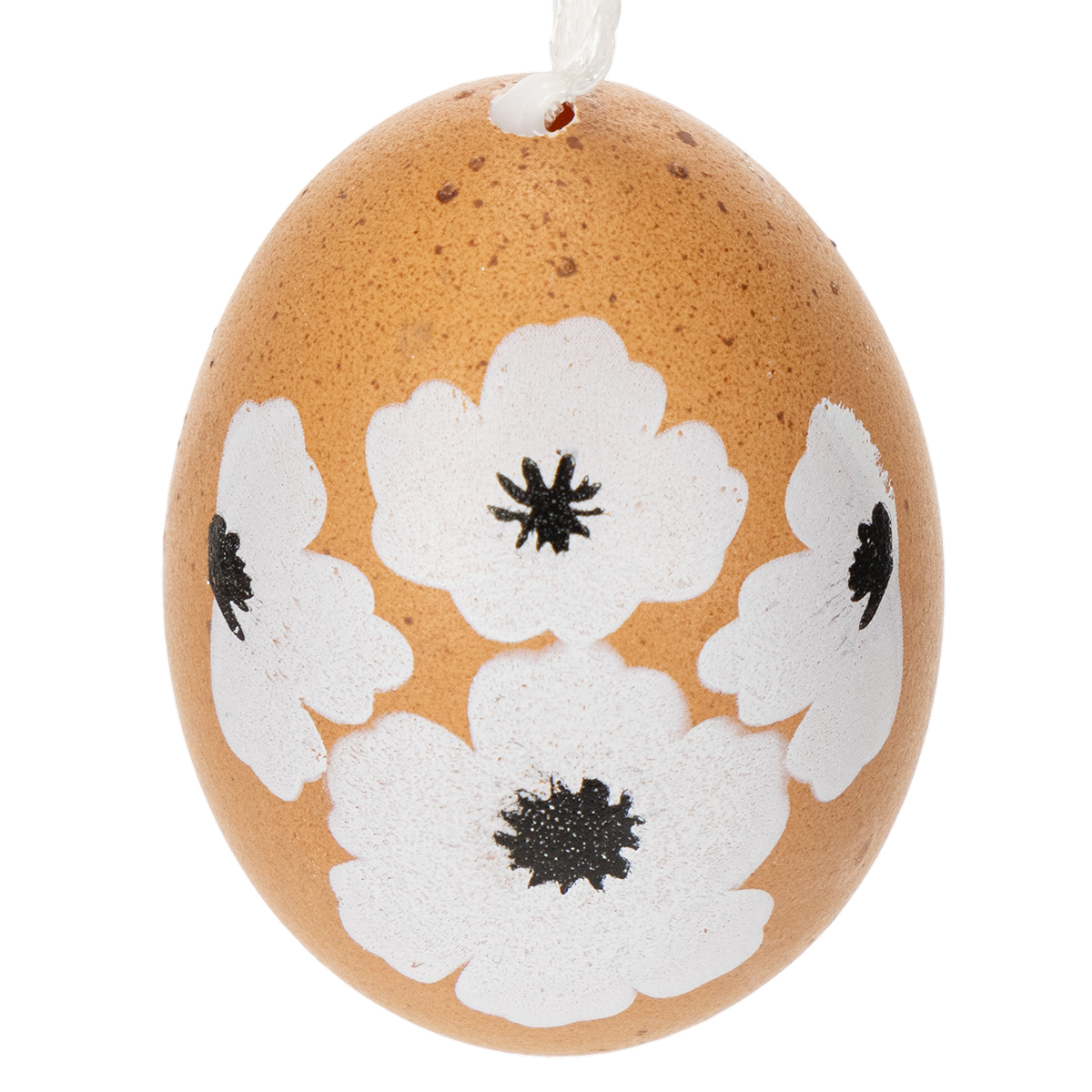 Diese dekorativen Ostereier sind etwas ganz Besonderes: Sie bestehen aus echten Hühnereiern, die behutsam ausgeblasen und sorgfältig mit Farbstempeln verziert wurden. Mit einer Größe von 6 cm passen sie perfekt an Ihren Osterstrauch oder in Ihr Fenster. Hängen Sie die Ostereier ganz einfach mit den angebrachten weißen Satinbändern auf. Die liebevoll gestalteten Motive – drei verschiedene florale Designs – verleihen Ihrem Zuhause ein einladendes Frühlingsflair. Besonders ihre natürliche, warme Farbgebung macht diese Deko zu einem Hingucker.