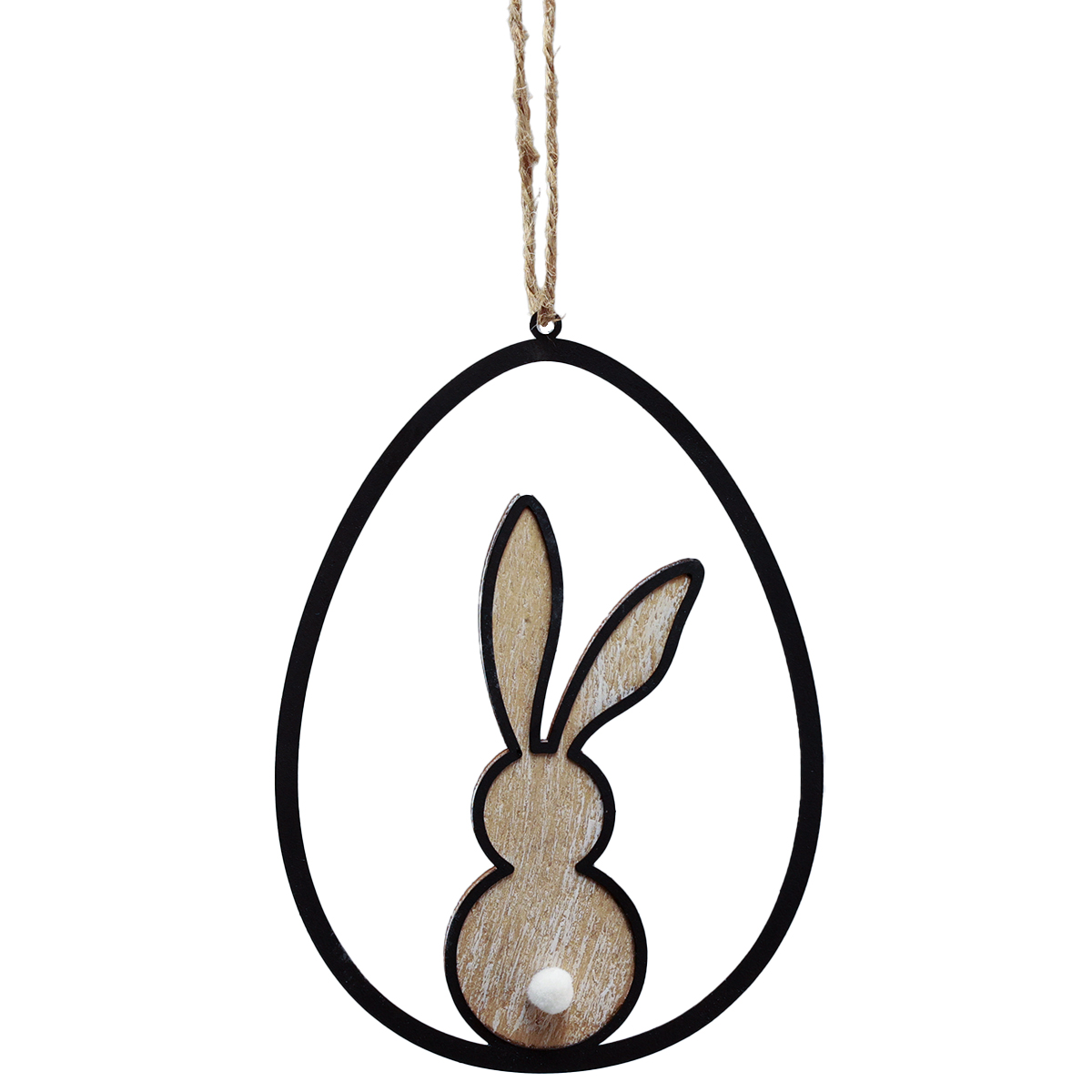 Die kleine Deko-Figur für Ostern sitzt in einem schwarzen Rahmen aus Metall in der Form eines großen Ostereis. Die aus leicht geweißtem Holz ausgeschnittene Figur wird ebenfalls von schwarzem Metall umrahmt. Besonders niedlich an den kleinen Osterhasen als Anhänger ist das weiße Schwänzchen, das extra aufgesetzt wurde.