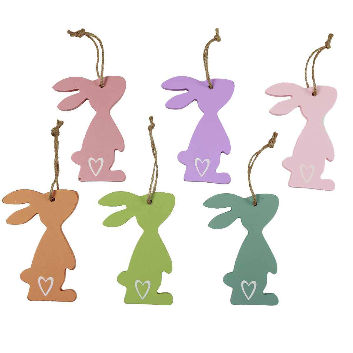 - Jeder Hängedeko-Hase ist mit einem Herz verziert