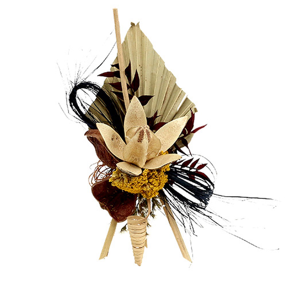 Dadurch sind Sie mit dem Palmenspeer sehr flexibel, da das Naturmaterial sowohl in einem Tischgesteck als auch in einem Trauerstrauß oder in einer Wanddekoration eingebaut werden kann. Dabei können Sie das in Speerform geschnittene Palmenblatt entweder mit dem Stiel in Ihre Deko einarbeiten oder den Kopf abtrennen und diesen mit etwas Sprühkleber fixieren. So können Sie mit mehreren Palmspeeren eine fächerartige Struktur erstellen, die auch als Grundlage für eine Dekoration dienen kann.