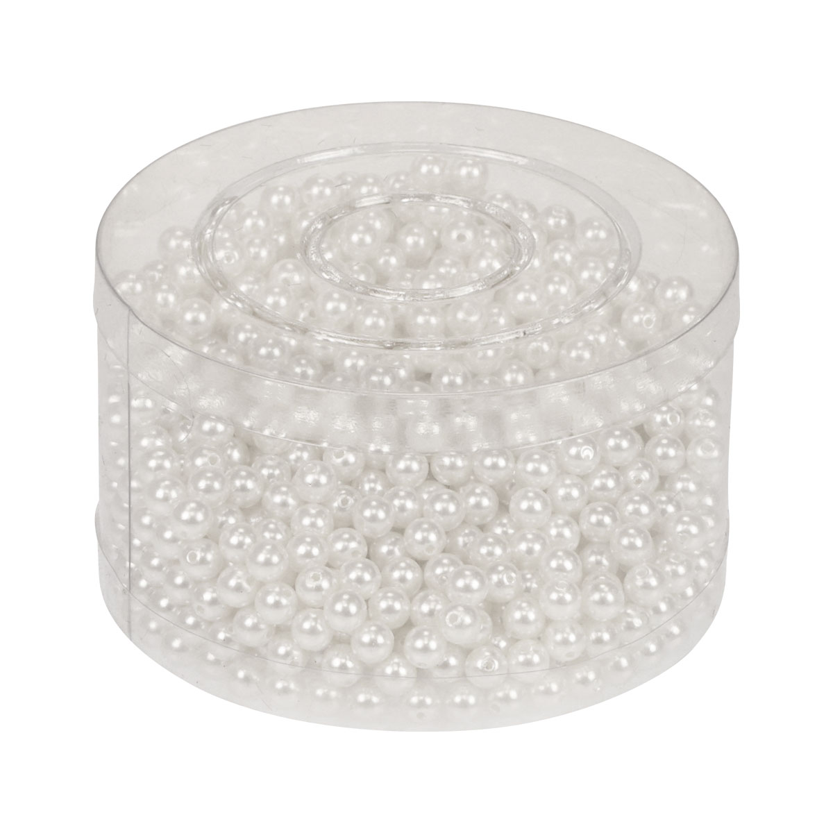 Die Kunststoff-Perlen in Weiß erhalten Sie in einer Packung mit einem Gewicht von etwa 300 Gramm. Dies entspricht einer Menge von circa 1100 Perlen. Eine einzelne Perle hat einen Durchmesser von rund 6 Millimetern.