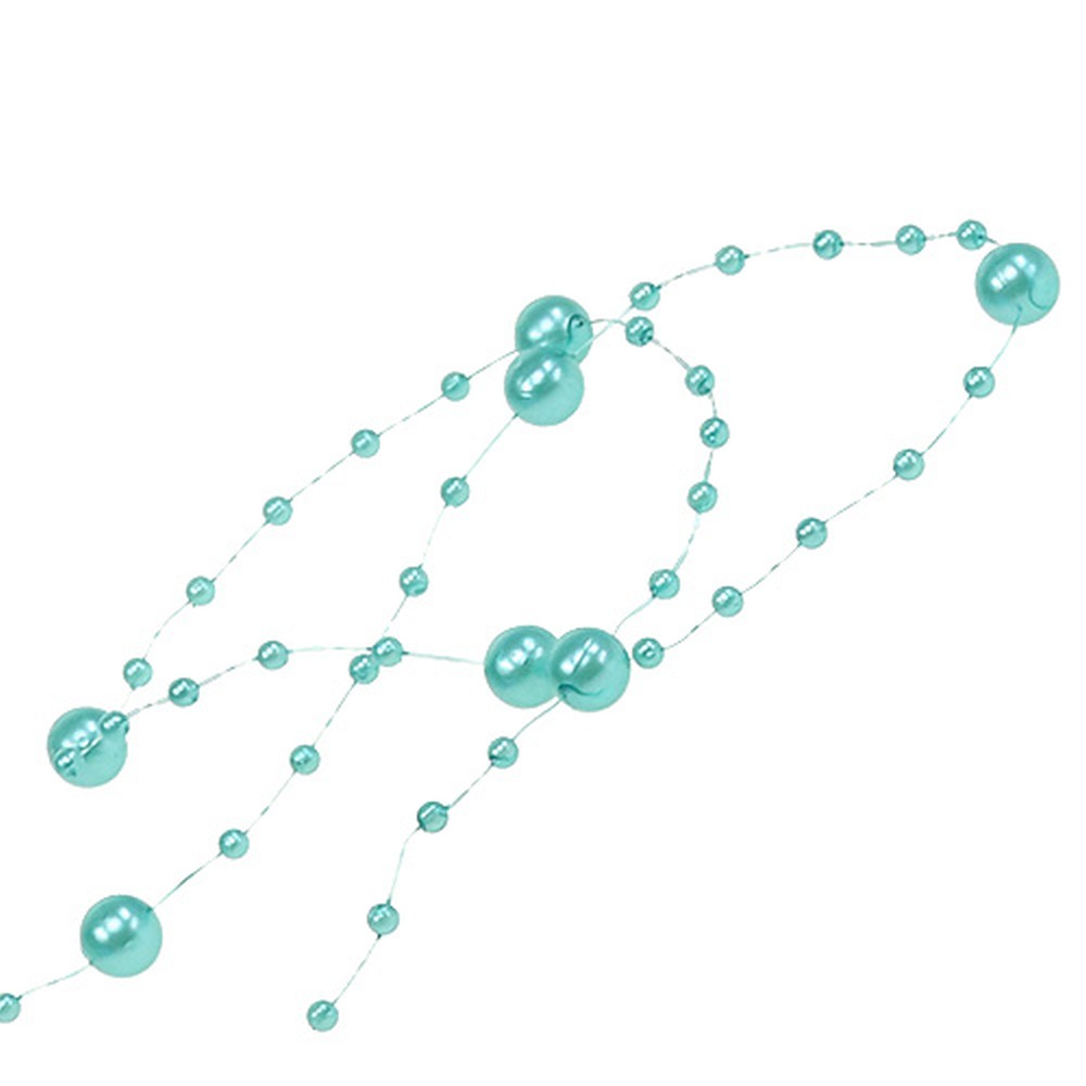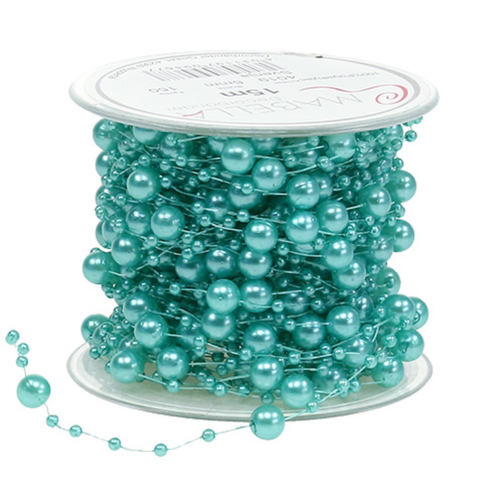 Das Perlenband in Türkis ist auf eine Kunststoffspule gewickelt und hat eine Länge von ungefähr 15 Metern. Die Perlen sind entweder circa 3 Millimeter oder etwa 6 Millimeter im Durchmesser groß.