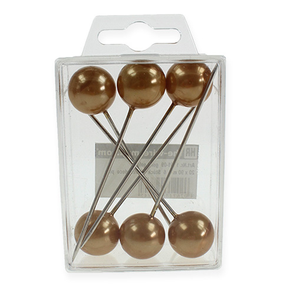 Die 6 gold- und silberfarbenen Perlkopfnadeln, die Sie hier in einer kleinen Kunststoff-Box erhalten, sind alle circa 90 Millimeter lang. Dabei liegt der Durchmesser der einzelnen Perlen bei ungefähr 20 Millimetern.