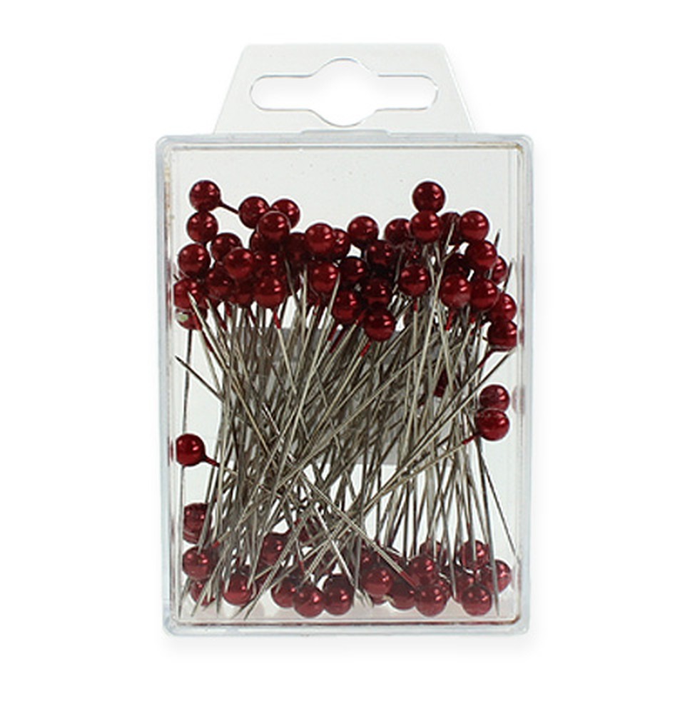 Die Perlkopfnadeln in Rot werden in einer praktischen Hängebox mit je 100 Exemplaren ausgeliefert. Eine Nadel ist etwa 65 Millimeter lang; die Perle hat einen Durchmesser von circa 6 Millimetern.