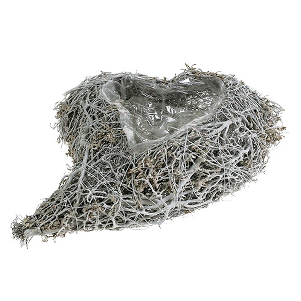 Das Herz zum Bepflanzen besteht aus getrocknetem und geweißtem Zweigmaterial, stabilem Metalldraht und transparenter Folie. Die Gesamtmaße liegen bei ungefähr 38 × 32 × 7,5 Zentimetern, während die mittig platzierte Öffnung in etwa 18 × 18 Zentimeter groß und circa 7 Zentimeter tief ist.