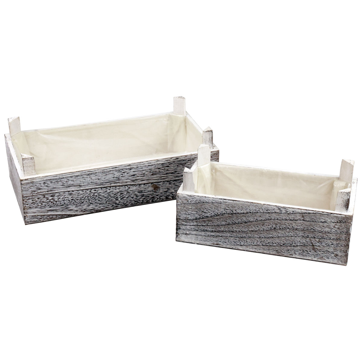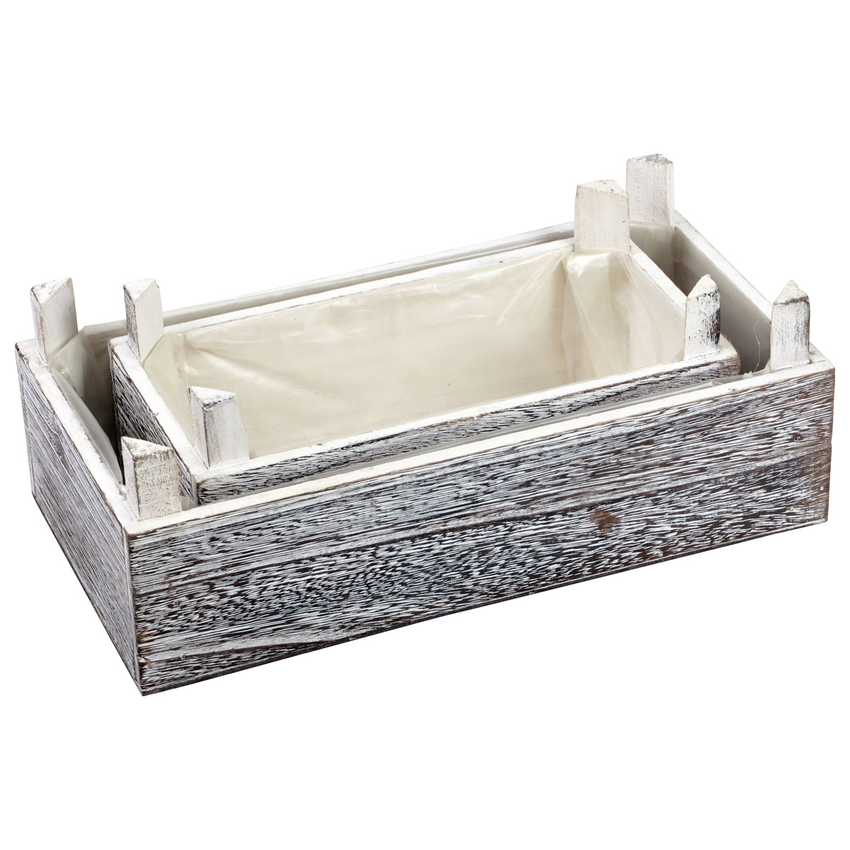 Unsere geweißten Vintage-Pflanzkisten werden als 2er-Set in zwei verschiedenen Größen geliefert, um Ihnen vielseitige Dekorationsmöglichkeiten zu bieten.