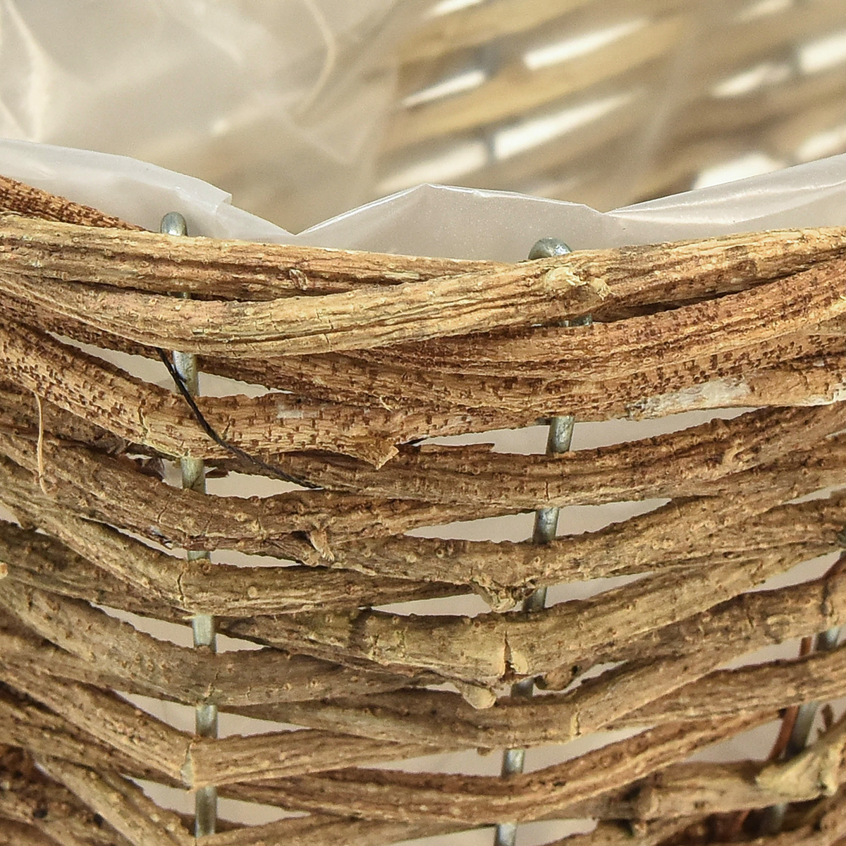 Unser ovaler Korb für Pflanzen ist mehr als nur ein Behälter. Die fein verwobenen Rebenzweige bilden zusammen mit der stabilisierenden Gitterschale aus Metall eine robuste Blumenschale. Die eingelegte Folie, fixiert durch dunkelbraunes Garn, schützt die Pflanzschale vor Feuchtigkeit. Mit einer Länge von etwa 30 Zentimetern eignet sich dieser dekorative Pflanzkorb ideal für Ihre Blumenarrangements oder als aparte Tischdekoration bei Veranstaltungen.