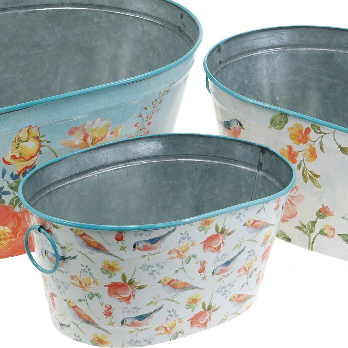 Pflanzschalen, Frühling, Pflanzkübel Blumen/Vögel, Metallgefäß oval L39/31/24,5cm 3er-Set