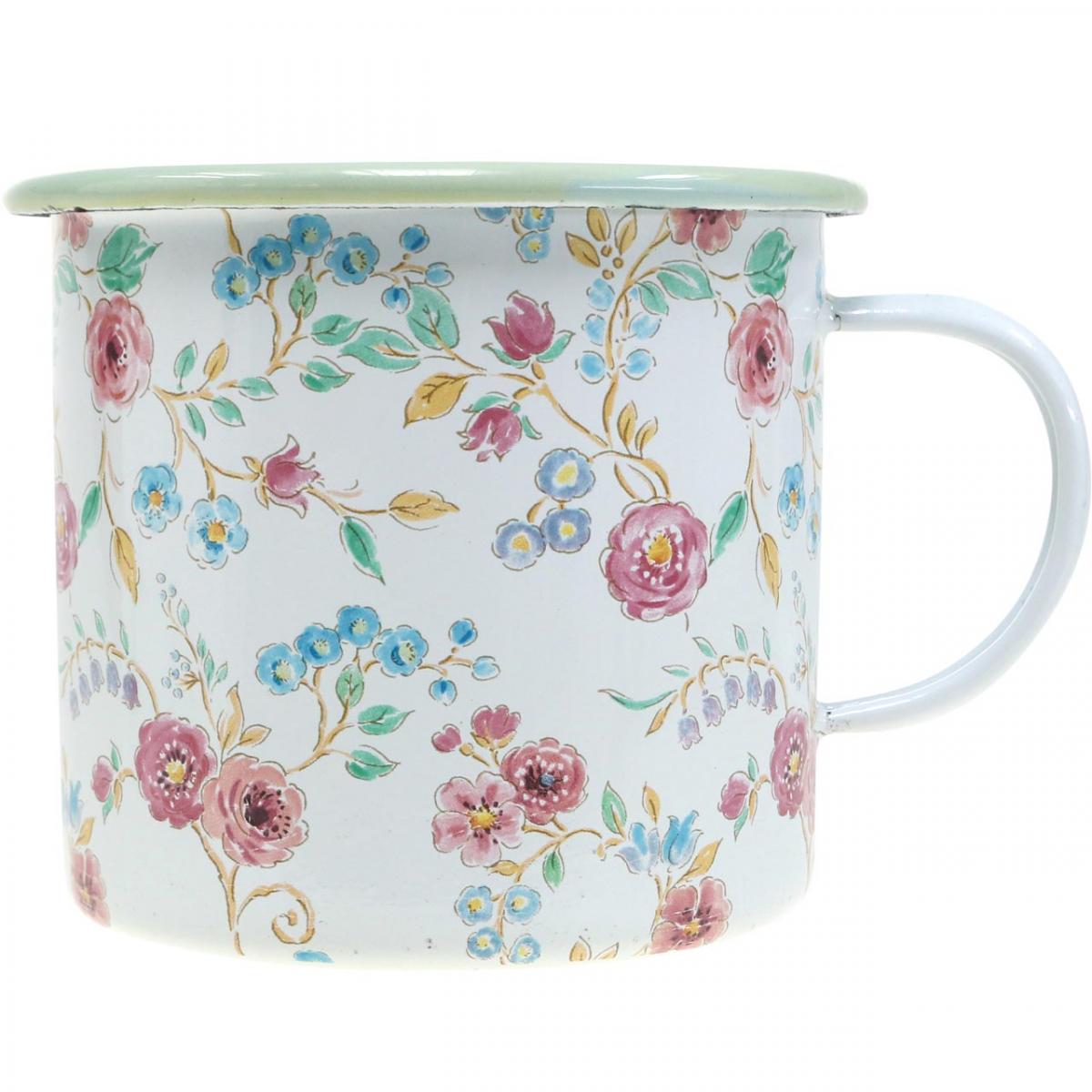 Produktname: Pflanztasse Rosen Emaille Deko Tasse mit Henkel Weiß Ø9,5cm