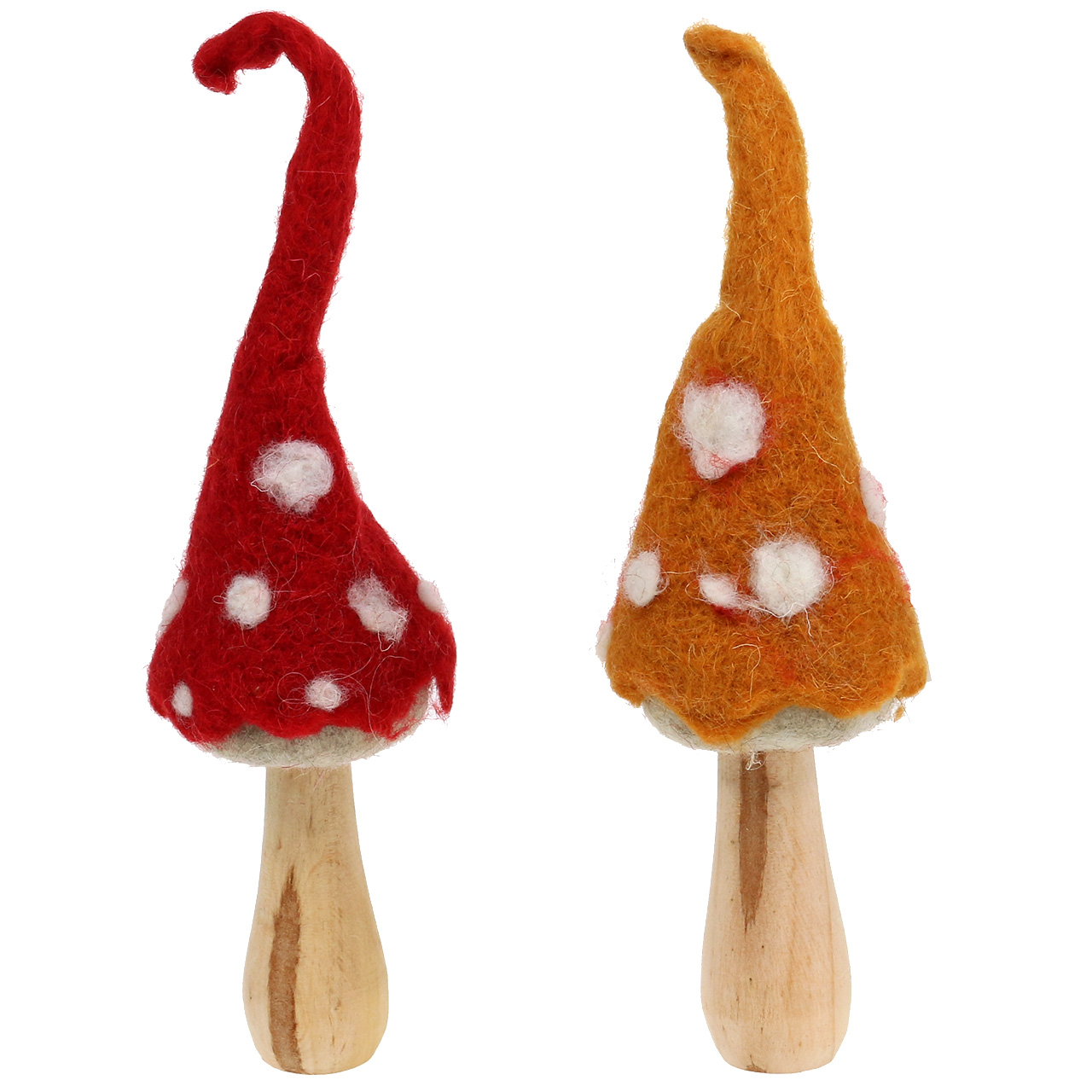 Sie erhalten die putzige Herbstdeko in einer Tüte aus Kunststoff. Dabei schwankt die Größe der beiden Pilze zum Stellen – wenn die Spitzen der Hüte gerade aufgerichtet sind – durch den nachgiebigen, weichen Filz ungefähr zwischen 28 und 29,5 Zentimetern. Die Breite variiert circa zwischen 7 und 7,5 Zentimetern.