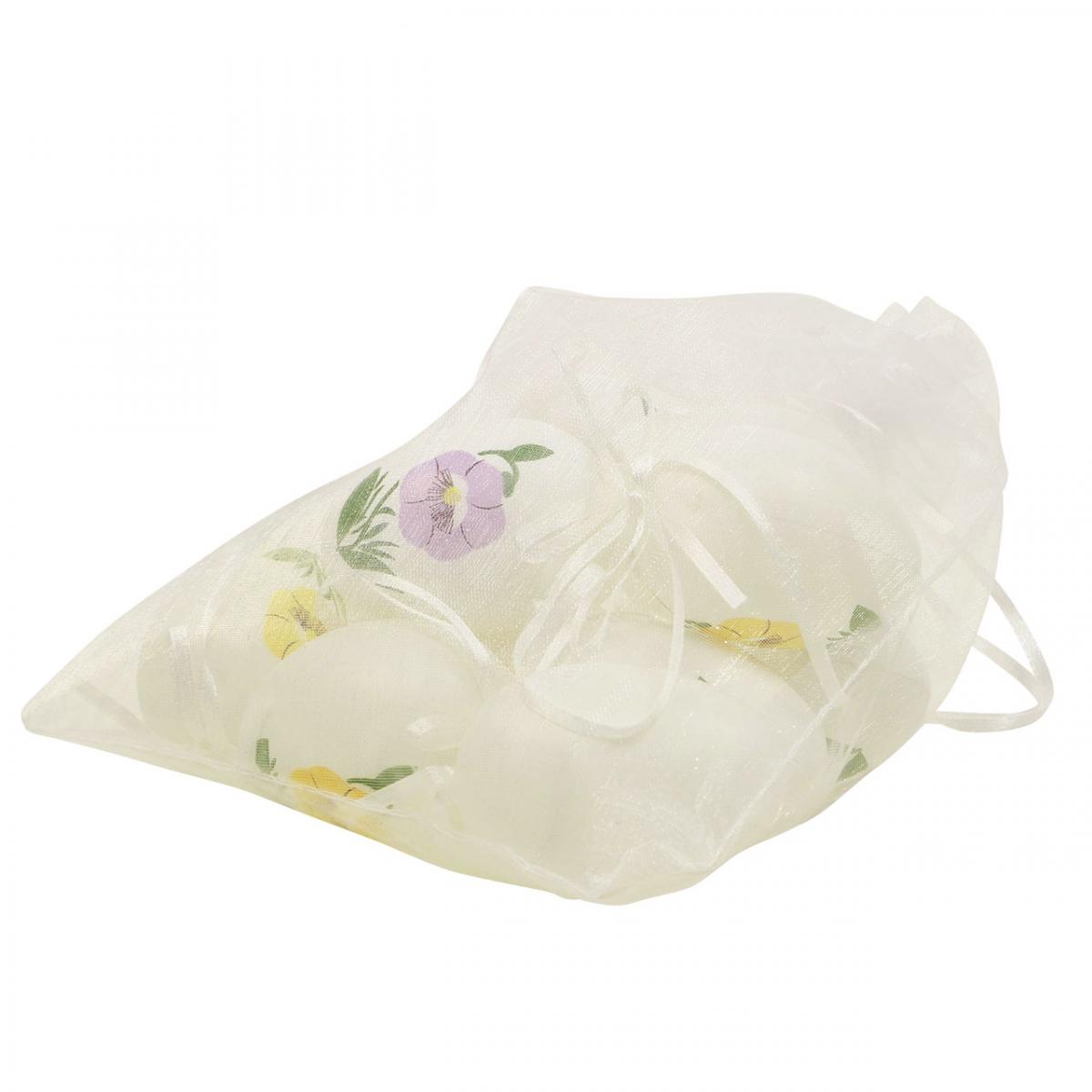 Mit diesem Set erhalten Sie insgesamt 12 Ostereier mit Blumenmuster, von denen jeweils 4 Stück in Gelbe, Lila oder Rosa Blumen haben. Die Eier bestehen aus leichtem Kunststoff, sind mit Satinschlaufen ausgestattet und besitzen eine Größe von ungefähr 6 Zentimetern.