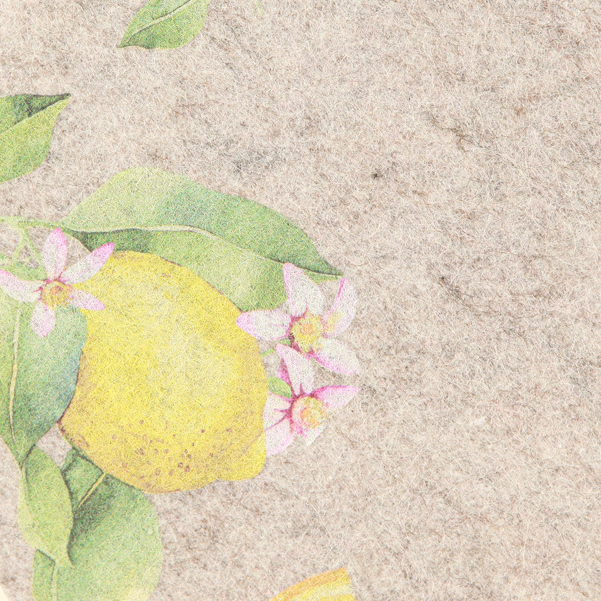 Die Zitrone als Motiv ist nicht nur dekorativ ansprechend, sondern symbolisiert Frische, Fruchtbarkeit und Reinheit. In der Farbpsychologie steht Gelb für Lebensfreude, Optimismus und Kreativität. In Kombination mit dem schlichten Grau des Filzes entstehen harmonische Kontraste, die Ihr Zuhause in ein lebendiges Sommerparadies verwandeln können. Zitronen sind in vielen Kulturen auch ein Symbol für Schutz und Reinigung, was diese Tischdeko zu einem idealen Begleiter macht.