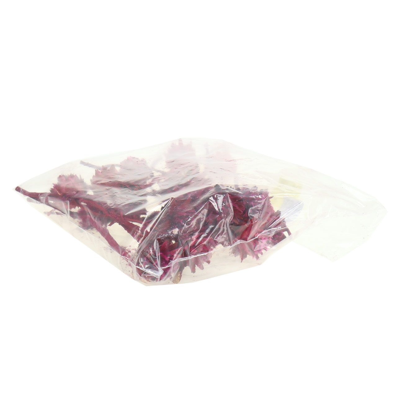 Die erikafarbene Trockenblume mit dem Namen Plumosum wird in einem Kunststoffbeutel zu insgesamt 25 Stück und in unterschiedlichen Größen geliefert. Die Gesamtgröße variiert dabei zwischen 21 und 30 Zentimetern und der Durchmesser der Blüten zwischen circa 4,5 und 5 Zentimetern.