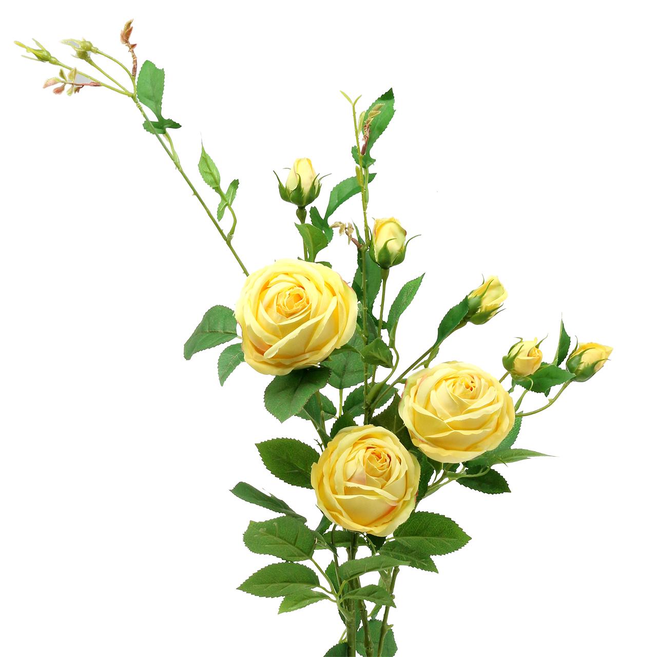 Der wunderschöne Rosenzweig mit seinen sonnengelben Blütenköpfen sorgt für langanhaltende Freude. Der Dekozweig aus Rosen sieht echten Rosen täuschend ähnlich und gehört auf jeden Fall zu einem klassischen Hochzeitsdekor und zu exklusiven Seidenblumen-Arrangements. Die hochwertige Kunstblume besteht aus einem kräftig gewachsenen Zweig mit Dornengespicktem verzweigten Stiel. Dabei sehen sogar die kleinen Dornen aus wie in der Natur gewachsen, da sie sehr filigran gearbeitet sind. An dem Rosenzweig befinden sich drei prächtige Blüten und fünf Knospen. Der Stiel ist mit einem Metalldraht im Inneren versehen, sodass er sich leicht und flexibel für Arrangements zurecht biegen lässt.