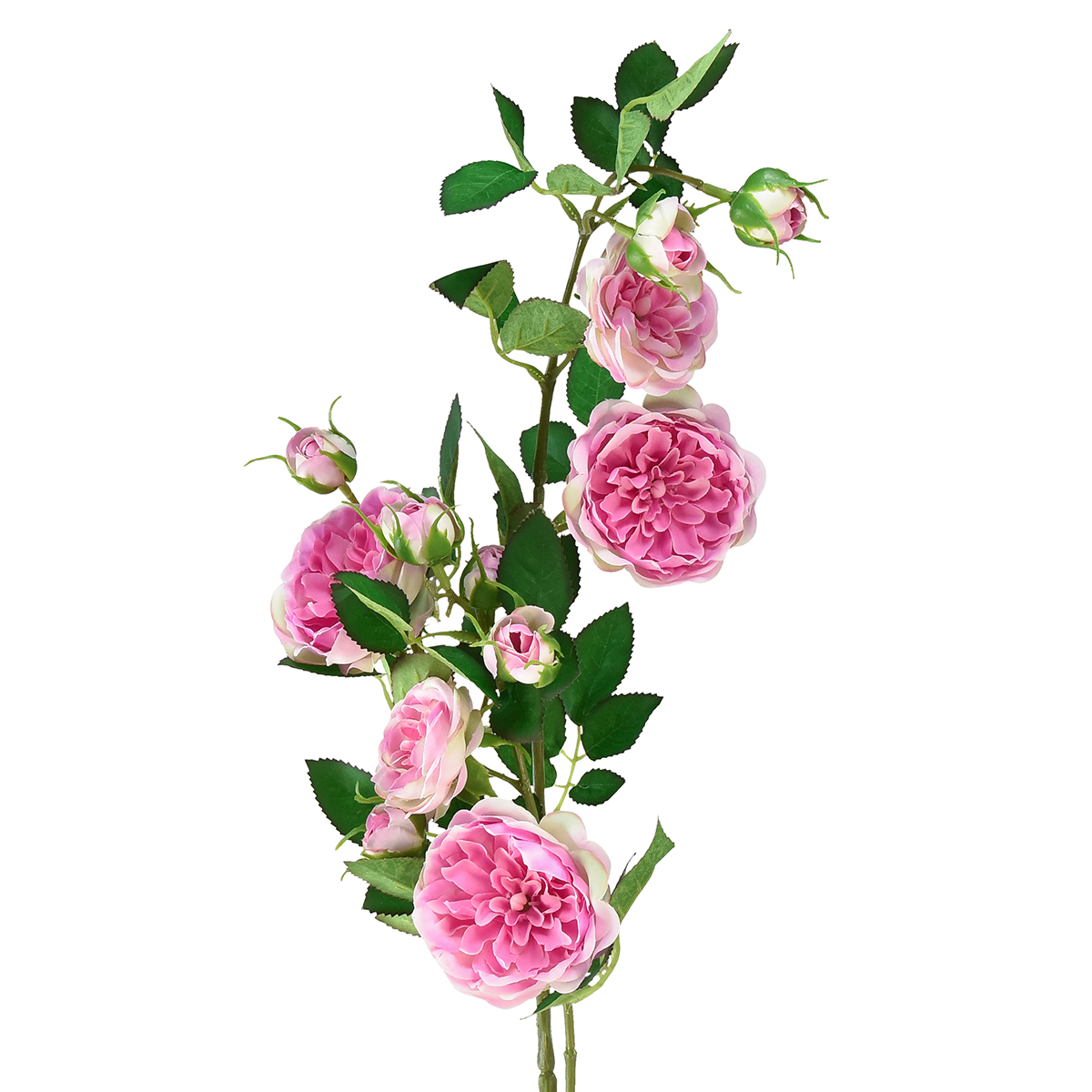 Die Gesamtlänge des pinken Rosen-Zweigs beträgt in etwa 79 Zentimeter. Die künstlichen Rosenblüten haben einen Durchmesser von circa 2, 5 und 6,5 Zentimetern.