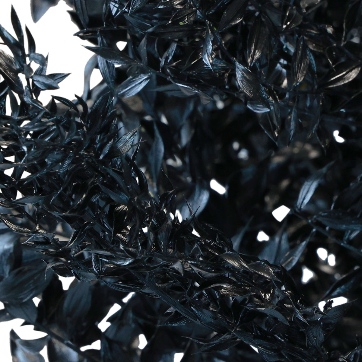 Tiefschwarz gefärbt, schonend konserviert und getrocknet, bewahrt der Ruscus, auch als Mäusdorn bekannt, seine natürliche Schönheit. Die abstehenden, spitz zulaufenden Blätter eignen sich wegen ihrer klaren Konturen hervorragend für Weihnachtsdeko, Trauerfloristik und andere Gestecke mit Exoten.
