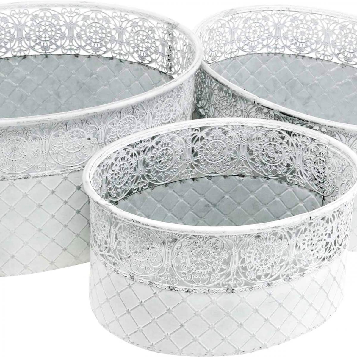 Produktname: Schale zum Bepflanzen, Metallgefäß mit Spitzenmuster, Dekotopf oval Weiß, Silbern Shabby Chic L41,5/35/29,5cm H19/16/14,5cm 3er-Set