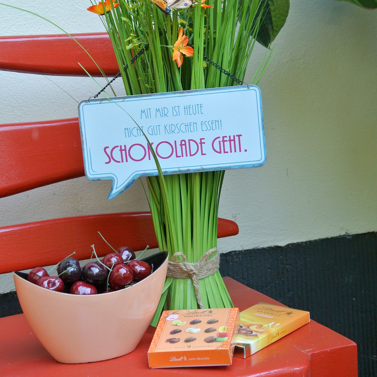 Das Schild zum Aufhängen mit einem frechen Spruch zum Thema „Kirschen und Schokolade“ besteht aus lackiertem Metall und hat etwa folgende Maße: 24 Zentimeter mal 13,5 Zentimeter. Dabei beträgt die Gesamtlänge mit Aufhänger circa 24 Zentimeter.
