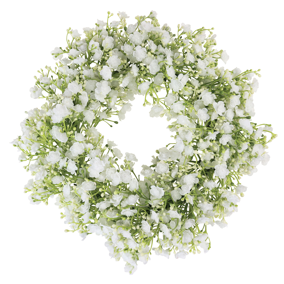 Der künstliche Blumenkranz ist eine romantische Deko-Idee für Hochzeiten und für den Frühling. Der Kranz mit der künstlichen Gypsophila eignet sich auch als Wand- oder Türdekoration und besticht durch seine liebevolle, naturnahe Gestaltung.