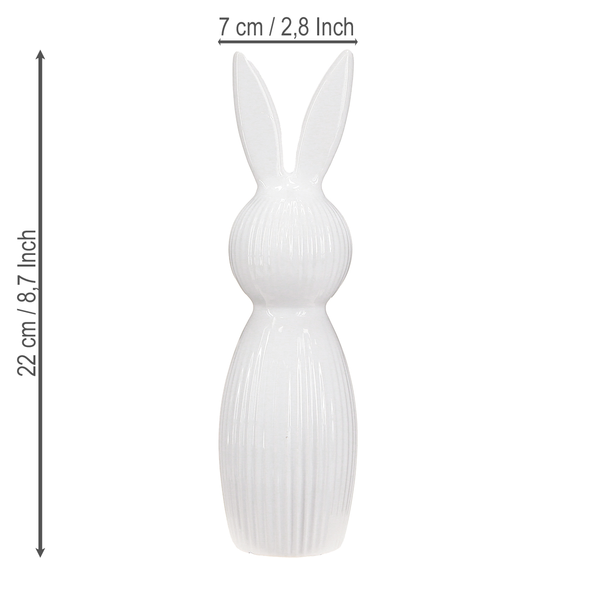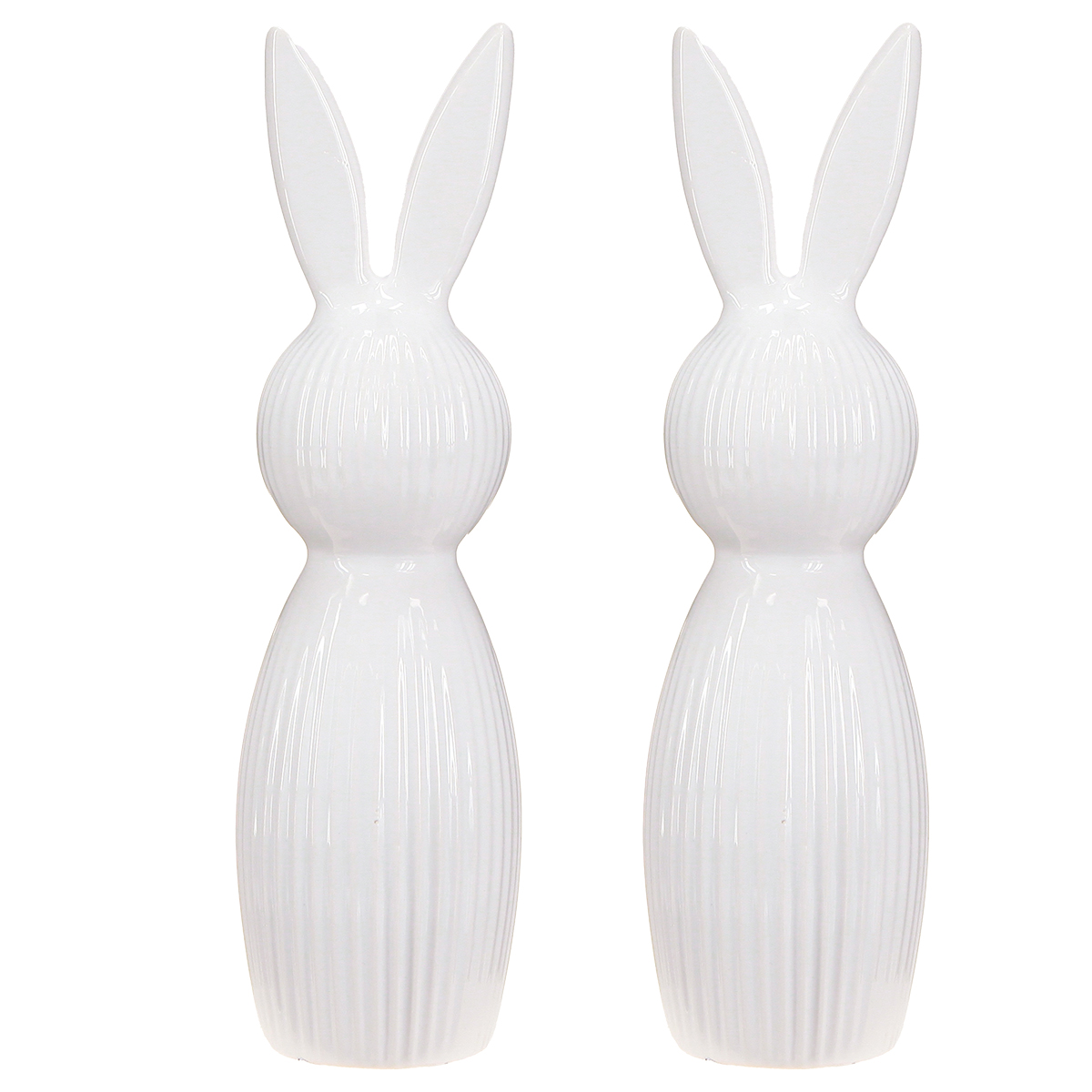 Die schlichte Hasenfigur aus hochwertiger Keramik zeichnet sich durch ihre einzigartige Verbindung aus minimalistischem Design und Funktionalität aus. Die hochglänzende Oberfläche verleiht den Figuren eine besondere Tiefe und Spiegelung, wodurch sie sich sofort in den Mittelpunkt Ihrer Dekoration stellen. Sie sind perfekt geeignet für Frühlings- und Osterdekorationen, sei es auf dem Ostertisch, einem modernen Osterstrauß oder als ein subtiler Blickfang auf Ihrer Empfangstheke. Ihre Höhe von 22 cm bildet dabei die ideale Balance zwischen Präsenz und Zurückhaltung. Die leicht geriffelte Oberfläche macht die Hasenfigur nicht nur optisch, sondern auch haptisch zu einem Erlebnis. Wer es schlicht, aber elegant mag, wird Gefallen an der neutralen weißen Farbe finden. Sie harmoniert wunderbar mit nahezu jedem stilistischen Arrangement: moderne Glaskerzenständer, minimalistisch designte Vasen oder andere helle Frühlings-Accessoires. Ob Sie diese Dekohasen einzeln oder im Set als Paar im Raum wirkungsvoll positionieren, bleibt ganz Ihrer Kreativität überlassen! Ein kleiner Tipp: Ergänzen Sie die Figuren mit weiteren weißen Keramik-Dekoelementen oder kombinieren Sie sie mit pastellfarbenen Highlights – so schaffen Sie harmonische Akzente für eine rundum gelungene Frühlingsdekoration.