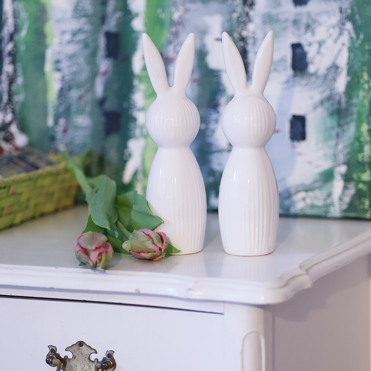 Frühling im Wohnzimmer, auf dem Sideboard oder im Fensterrahmen – kein Problem mit dieser zauberhaften Hasenfigur. Diese schlicht designte und 22 cm hohe Figur kommt im 2er-Set und bietet eine perfekte Symbiose aus moderner Eleganz und schlichter Ästhetik. Mit ihrer glänzend weißen Oberfläche und der dezenten Rillenstruktur wirkt sie edel, aber gleichzeitig unaufdringlich. Sie suchen nach einer Frühlingsdeko, die sich ideal in moderne Wohnstile wie den skandinavischen Minimalismus oder zeitgenössische Interieurs einfügt? Dann schauen Sie sich diese Keramik Hasenfigur einmal näher an. Besonders in Kombination mit frischen grün weißen Blumensträußen oder neben Frühlingsarrangements aus Dekoeiern ergänzt sie Ihren Stil perfekt. Klingt das verlockend? Greifen Sie jetzt zu und machen Sie Ihr Zuhause zu einem echten Hingucker der Jahreszeit!