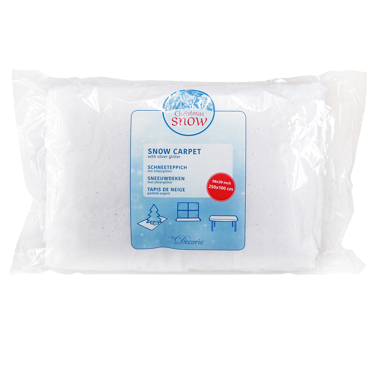 Durch die Verwendung von zusätzlichem Kunstschnee kann der winterliche Effekt zudem noch verstärkt werden. Der Schneeteppich mit Silberglitter hat eine Abmessung von rund 250 Zentimetern × 100 Zentimetern und ist zu 100 Prozent aus Polyester gefertigt.